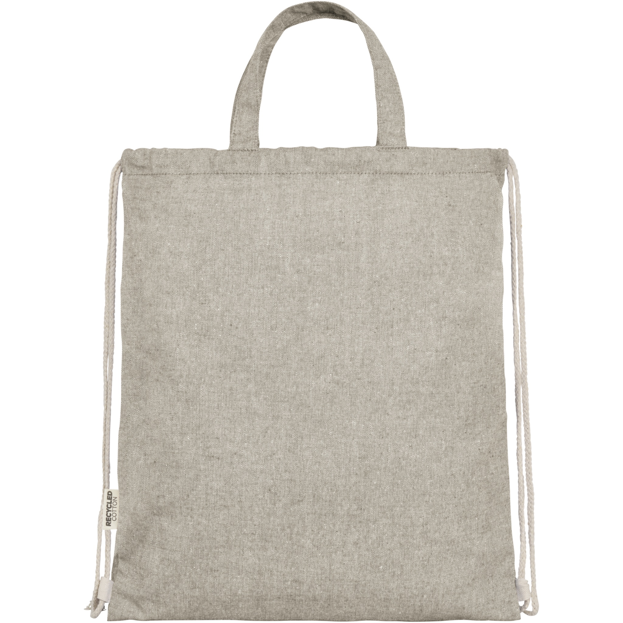 Drawstring bag made of a 150 g/m² recycled cotton polyester blend. Large main compartment with cotton drawstring closure in natural colour. Recycled cotton is manufactured from pre-consumer waste generated by textile factories during the cutting process. Similar colours are blended together so no additional dyeing is required. Due to the nature of recycled cotton, there may be a very slight colour variation. This distinctly adds to a more authentic appearance. Each backpack also comes with an Aware™ tracer. This innovative feature allows users to trace the origins and journey of their item through a QR code, enhancing transparency in the supply chain and fostering a stronger connection between the product and its production process. Resistance up to 5 kg weight. Handle length: 14 cm.
