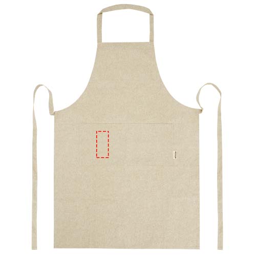 Apron made of 200 g/m² recycled cotton polyester blend. Features 2 adjacent pockets with a combined size of 45 x 20 cm, and a 1 metre tie back closure. Recycled cotton is manufactured from pre-consumer waste generated by textile factories during the cutting process. Due to the nature of recycled cotton, there may be a very slight colour variation. This feature distinctly adds to a more authentic appearance. Length of the neck strap: 55 cm.