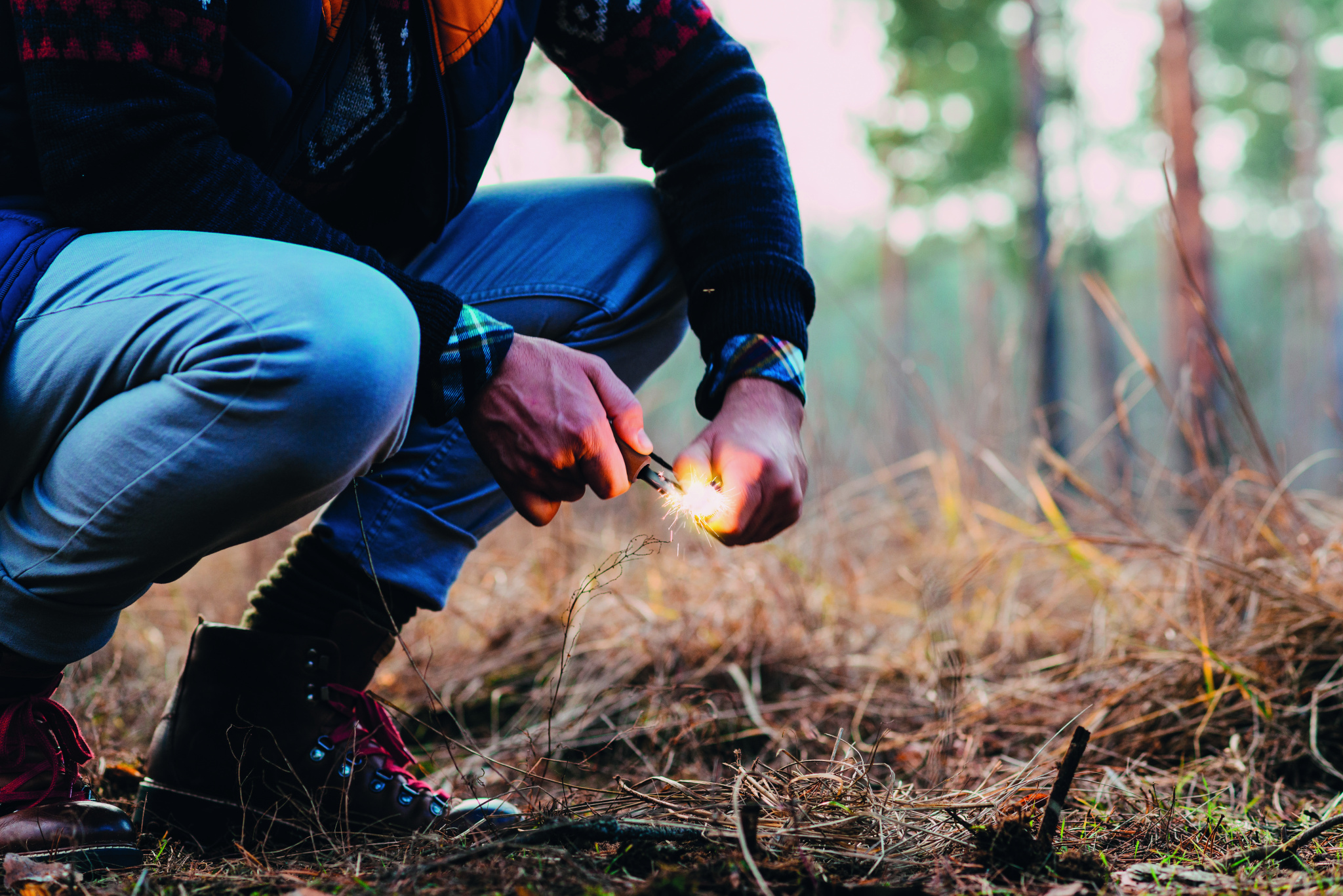 Fire starter tools in pine wood and stainless steel including a lighting stick, a multi-purpose scraper to use with your fire starter, bottle opener, precision ruler and hex key.