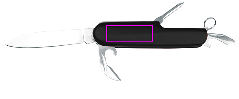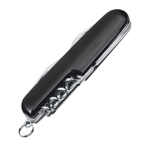 Handy stainless steel pocket knife with seven parts, including a large blade, can and bottle opener, corkscrew, Phillips and slotted screwdriver and a key ring. We engrave your logo on the aluminum shell.