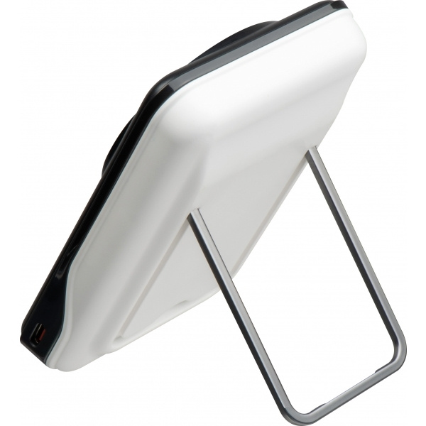 2-in-1 magnetic wireless power bank with stand, 10,000 mAh capacity. The stand allows the power bank to also be used as a smartphone holder. Includes a 30 cm cable with a USB-C connector, and the power bank features both USB-C and USB-A ports.