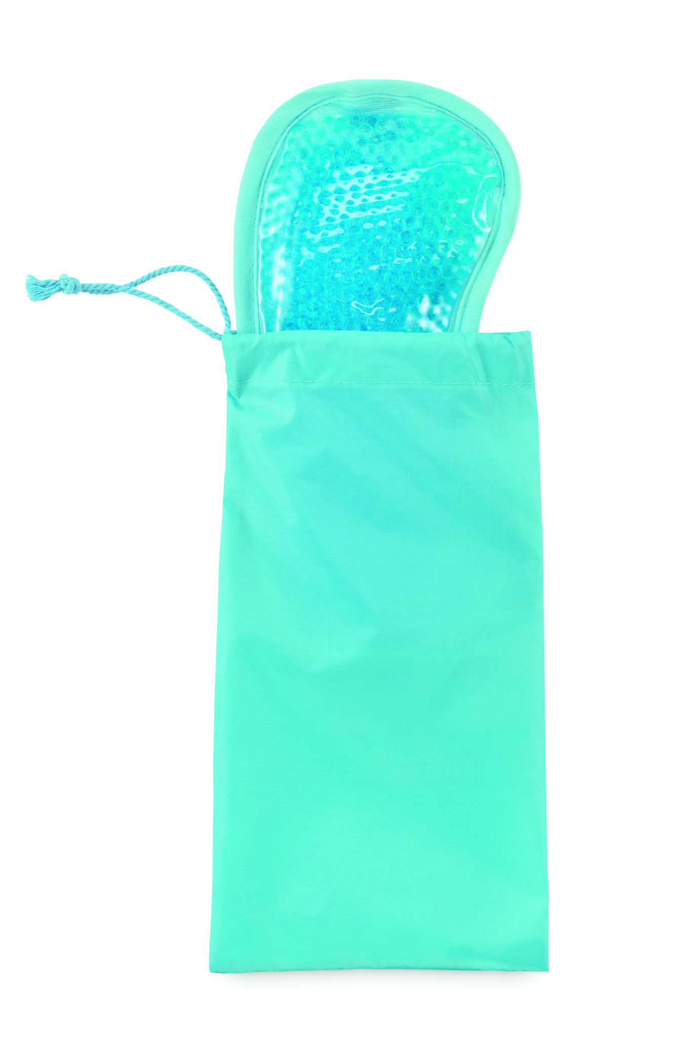 Reversible cooling eye mask filled with gel beads including 190T polyester drawcord pouch.