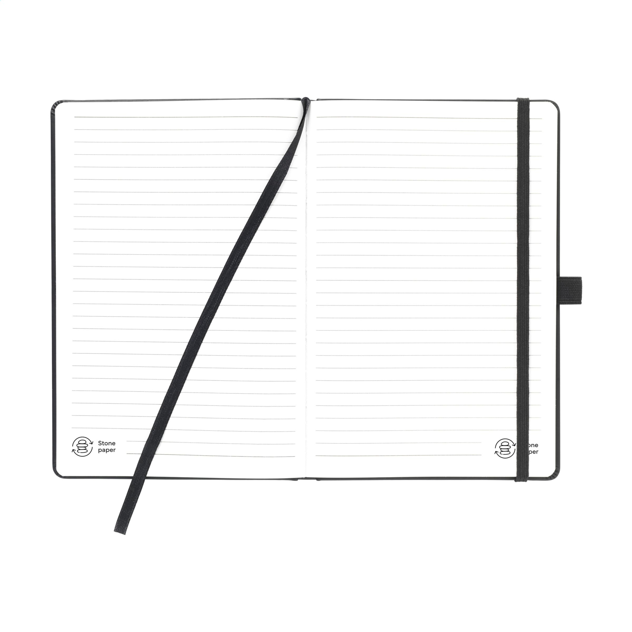 WoW! This A5-sized notebook is made from tree-free paper with approximately 64 sheets/128 pages of (170 gsm) cream-coloured lined paper. The paper is made from natural stone: 80% calcium carbonate and 20% resin (HDPE) to bind the stone. The cover is also made from 950 grams of stone paper with a Thermo PU finish. This booklet features a handy pen loop, elastic closure and reading ribbon. Stone paper is an alternative to ordinary paper because far fewer resources are used in production: no trees, no water, no bleach and no chemicals. In addition to the beautiful smooth paper, it can also be infinitely recycled. The paper is anti-bacterial, waterproof, and tear and stain-resistant.
