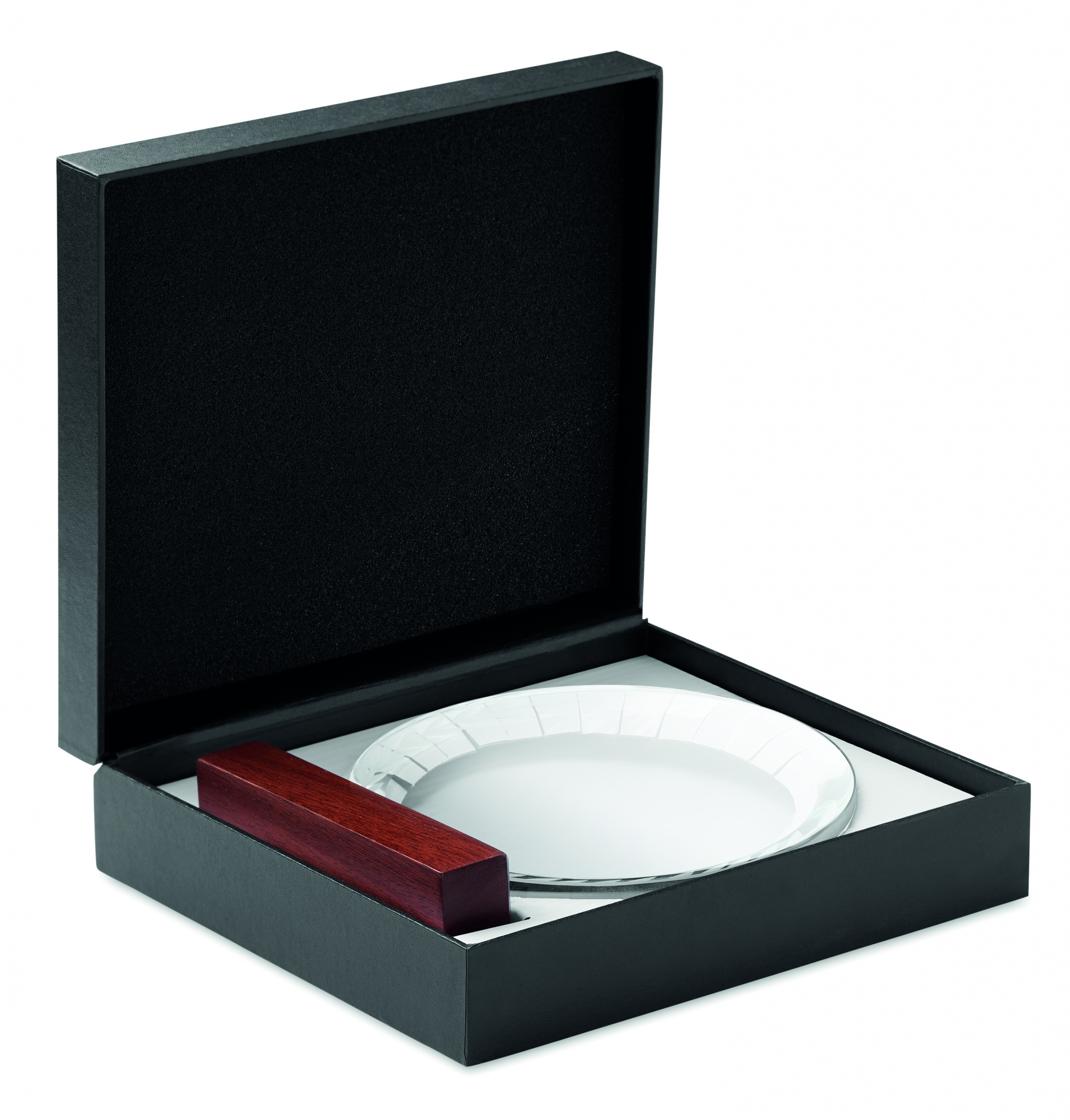 Round crystal award or memorial plaque on a beech wooden base in a gift box.