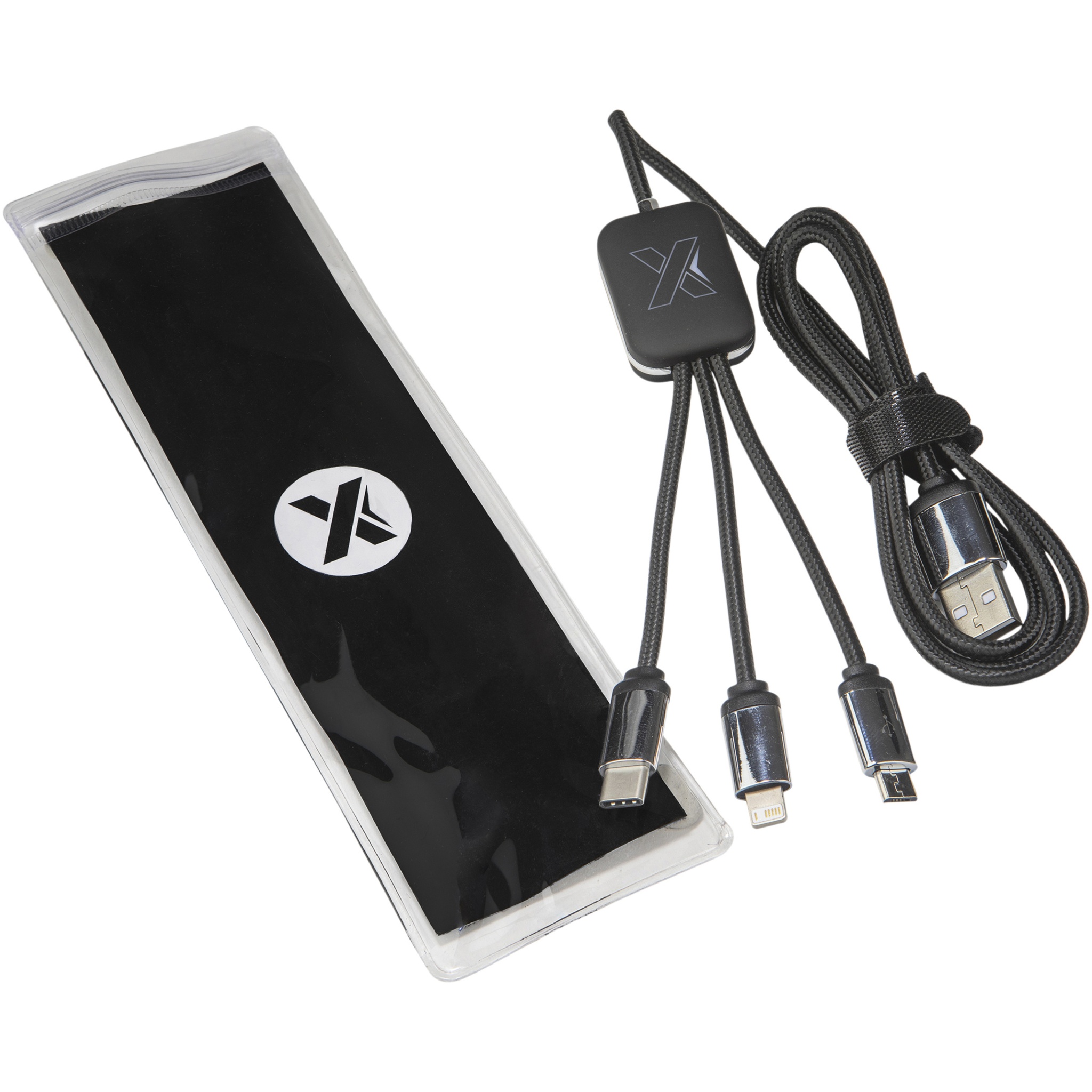 Light-up logo charging cable with rubber and metal finish fitted with three connectors (Type-C, Android, iPhone). Up to three devices can be charged simultaneously. Length of cables (including plugs): 10 cm. Total cable length: 1 metre. Recycled PET plastic cable and packaging is made of recycled paper and recycled plastic.