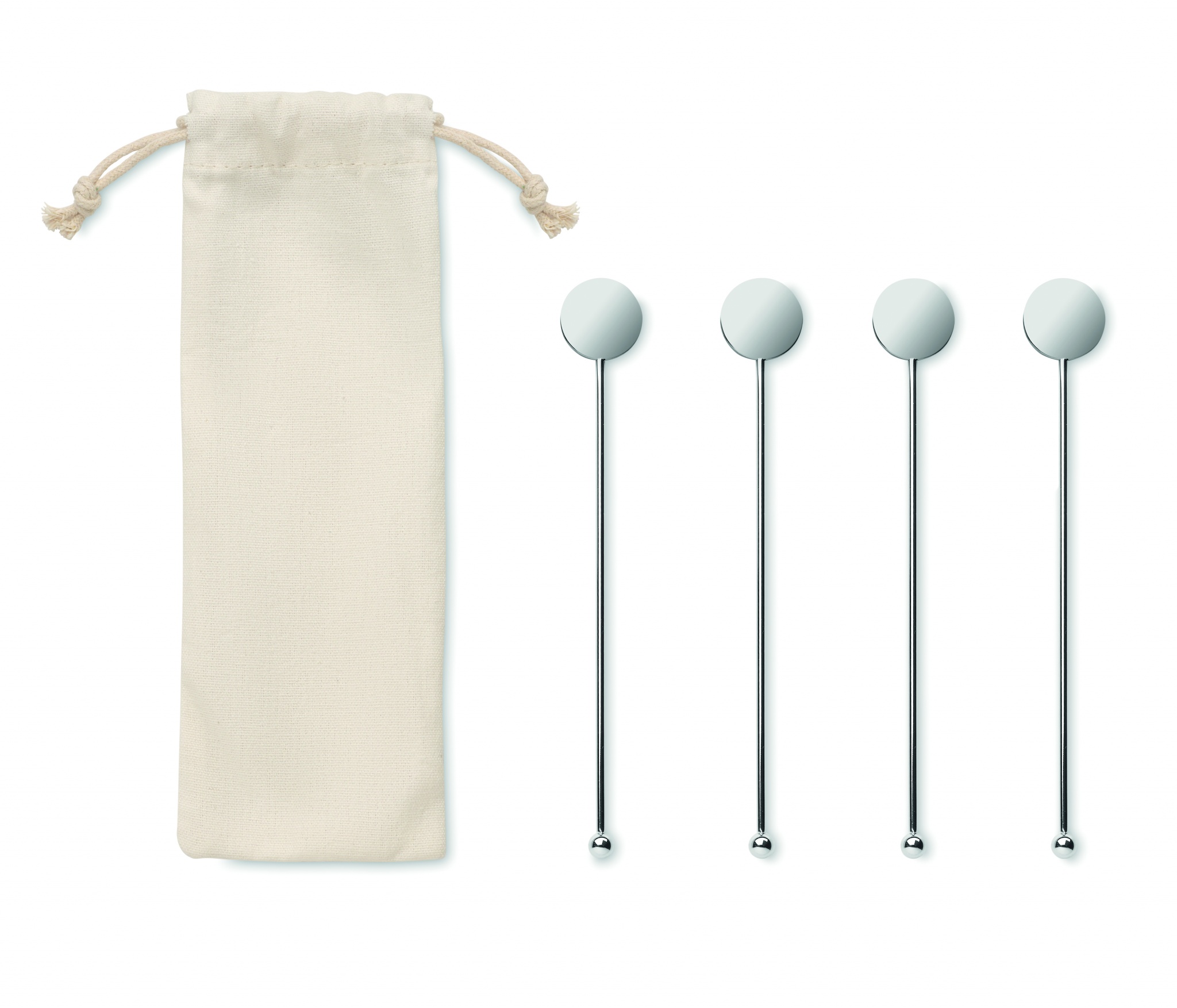 Set of 4 stainless steel drink stirrers in a cotton drawcord pouch.