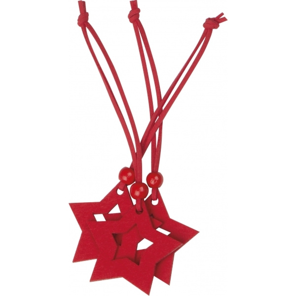 Set of three red felt stars with cord and wooden bead, decorative not only for the Christmas season. Your logo will be applied to the individual packaging by label.