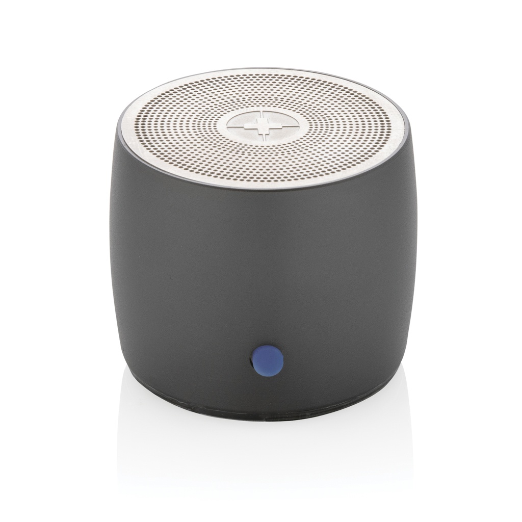 Small but powerful 3W wireless speaker made with RCS (Recycled Claim Standard) certified recycled aluminum and recycled ABS. Total recycled content: 28% based on total item weight. RCS certification ensures a completely certified supply chain of the recycled materials. Aluminum does not lose its characteristics in the recycling process and can be recycled endlessly. Including recycled type C charging cable made from RCS certified recycled TPE. Packed in FSC® mix packaging. The 500 mah battery allows a playtime up to 4 hours and can be fully re-charged in 2 hours. With BT 5.0 for smooth connection up to 10 metres. Item and accessories PVC free.