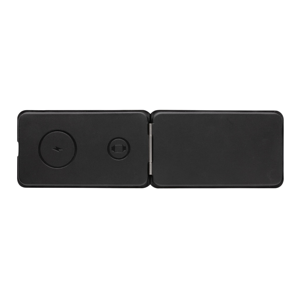 Luxury and foldable 3-in-1 wireless charger made with RCS certified recycled PU. Total recycled content: 5% based on total item weight. RCS certification ensures a completely certified supply chain of the recycled materials. The wireless charger comes equipped with a magnetic 15W wireless charger on the front. On the reverse is an additional 5W wireless charger suitable for earbuds cases or other small wireless chargeable devices and 2.5W wireless charger for smartwatches ( Apple watches only) Including RCS certified 120 cm recycled TPE cable. Packed in FSC® mix kraft packaging. Item and accessories 100% PVC free. Input: 9V/3A for optimal use. Output: Front: 9V/1.1A; 9V/1.67 A/(15W), Earbuds: 5V/1A (5W), Watch: 5V/0.5A.