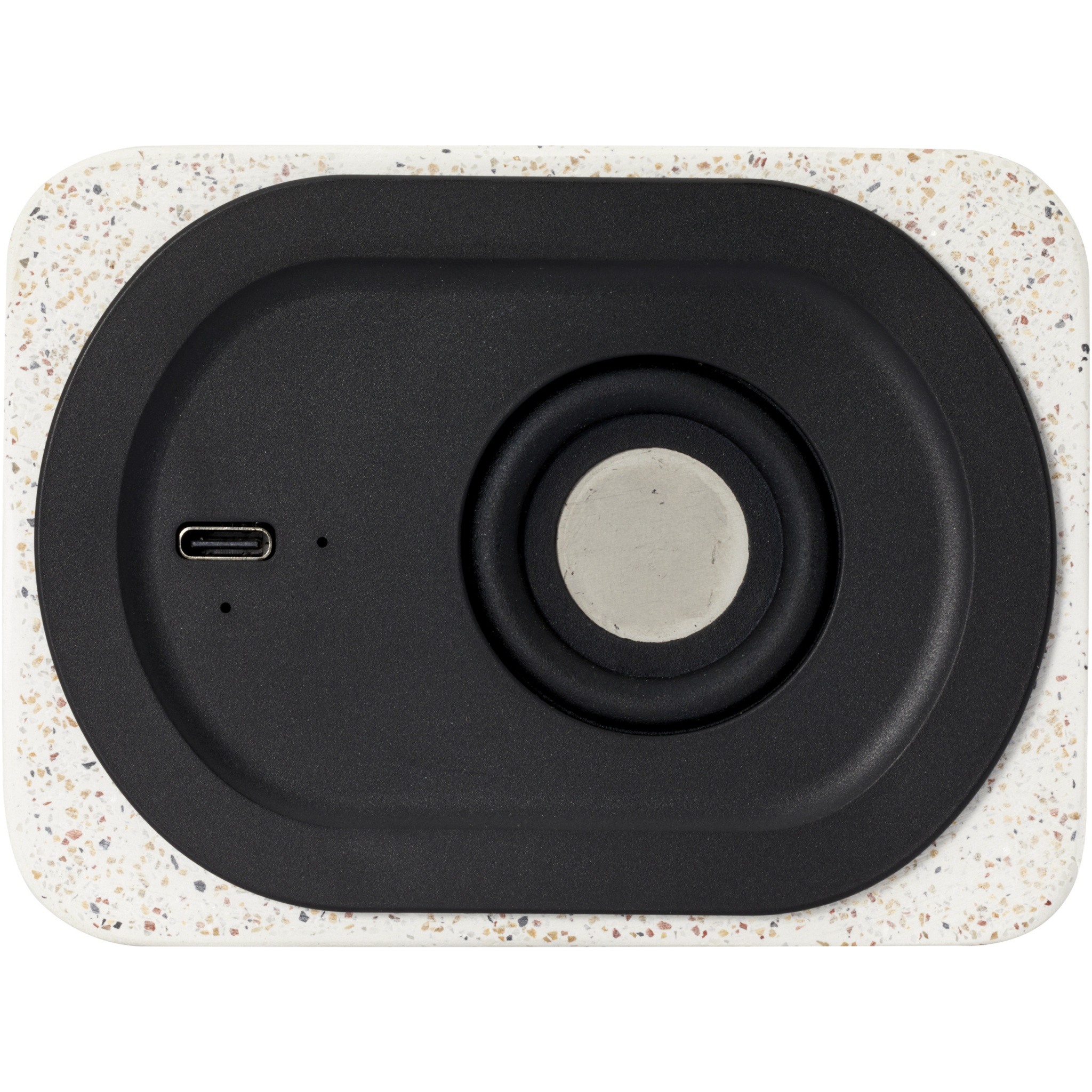 Bluetooth® speaker made of a combination of natural terrazzo and bamboo. Speaker output is 5W and it contains a 500mAh lithium polymer battery. Bluetooth® 5.0 working range up to 10 metres. This speaker allows up to 2 hours playback time at max volume, and it takes approximately 2 hours to charge from 0% to 100%. Delivered in a gift box with an instruction manual (both made of sustainable material).