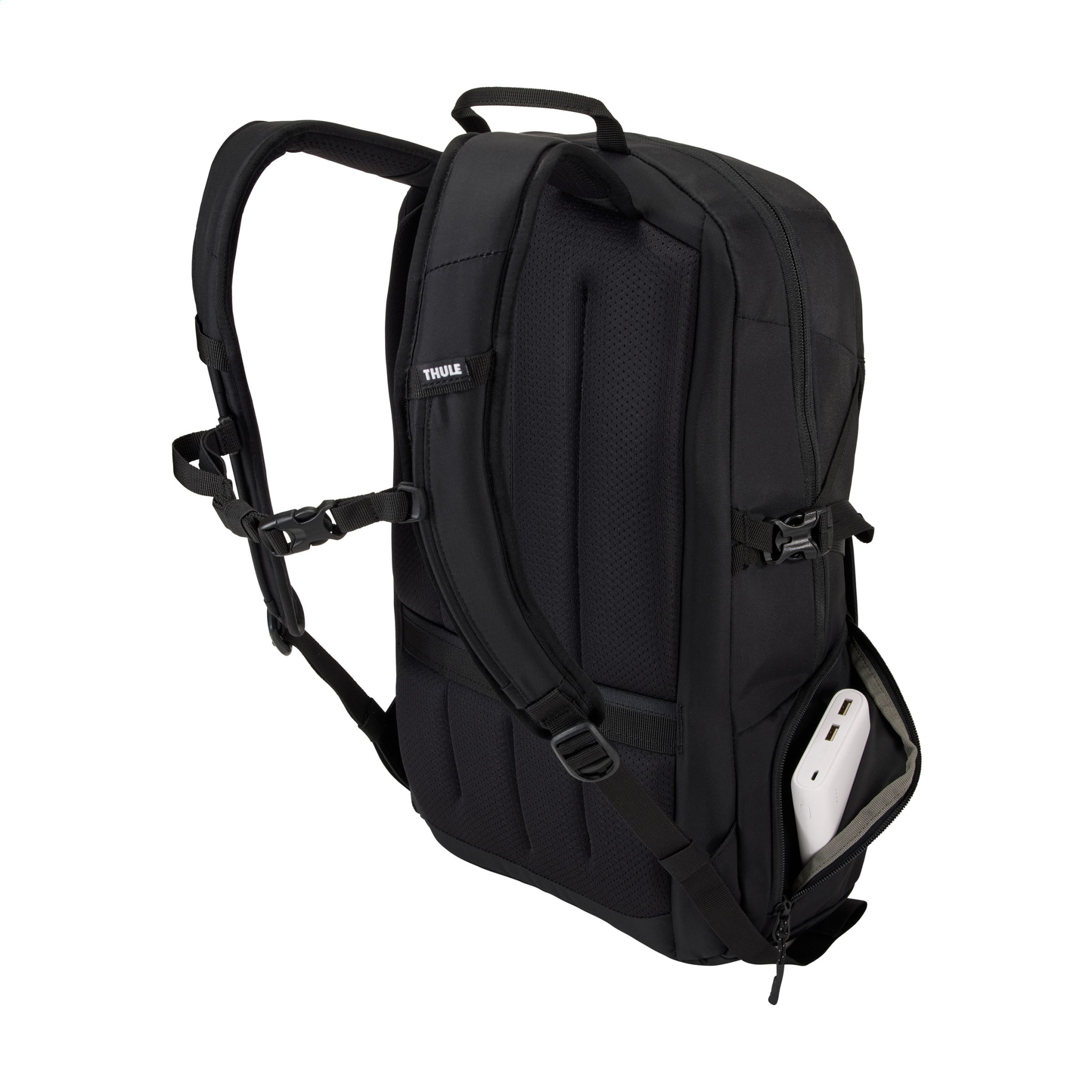 Slim and stylish backpack made from sturdy bluesign® approved 400D nylon from the Thule brand. With 2 compartments, it features plenty of storage space and pockets to keep all your stuff organised. With protective pockets for a laptop up to 15.6 inches and a tablet up to 10.5 inches. Inner pockets for storing small accessories and pens. Additional front zip pocket and an elastic mesh side pocket for carrying a drinking bottle. With various extras and a luggage strap for transporting on a trolley. The adjustable shoulder straps and back panel with airflow channel, feature foam and breathable mesh and guarantee excellent carrying comfort. Equipped with adjustable chest strap, YKK zips and fully lined. Designed for work and play. Capacity approx. 21 litres.