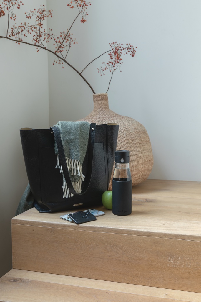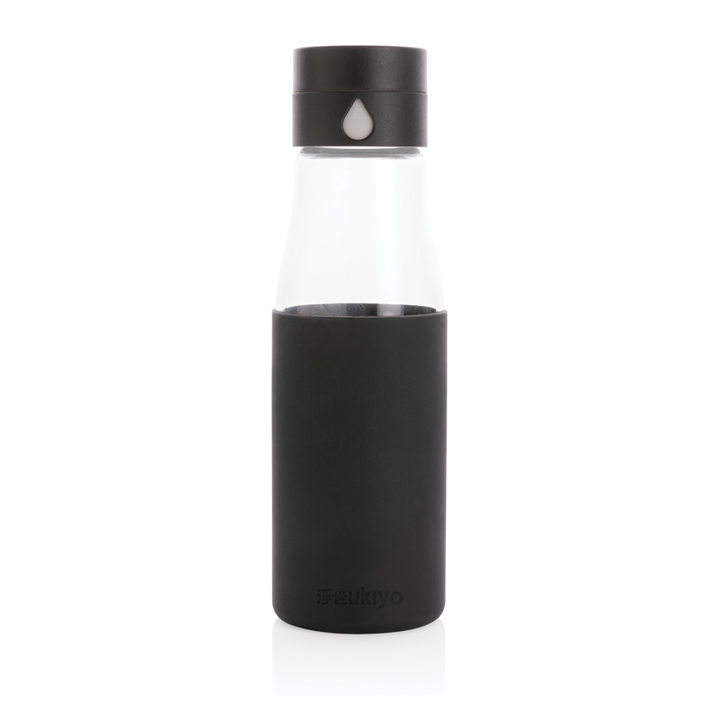 Ukiyo glass hydration tracking bottle with sleeve, black