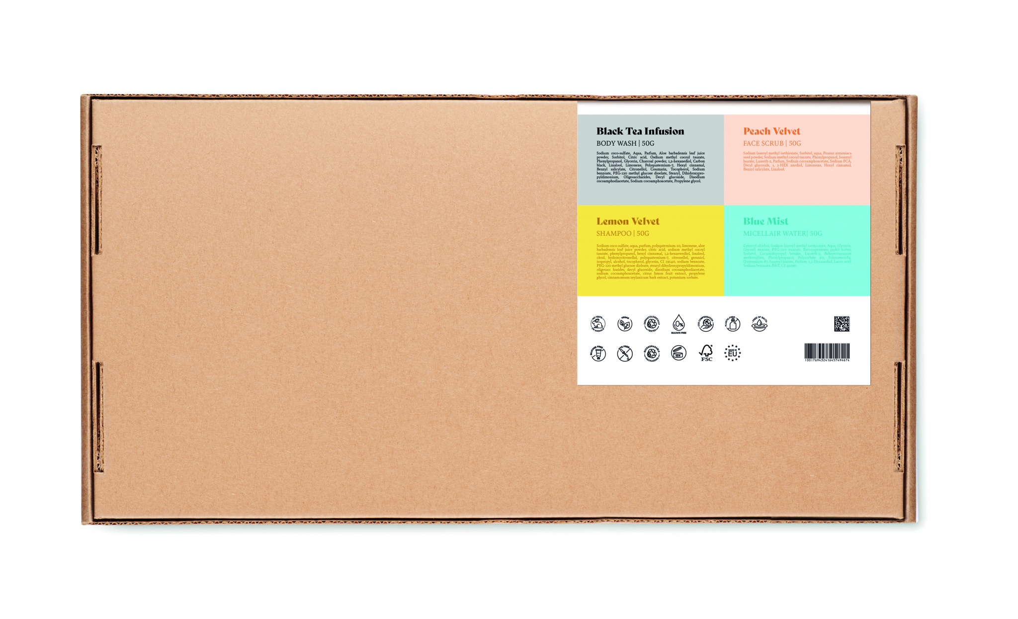Unisex beauty gift set by Branded By Earth. Includes vegan 50gr of body wash, shampoo, face scrub, micellar water bag and a cork soap tray. All pieces wrapped in paper. Presented in recycled paper box. Made in EU. Cork is 100% natural material. Due to its structural nature and surface porosity the final print result per item may have deviations.