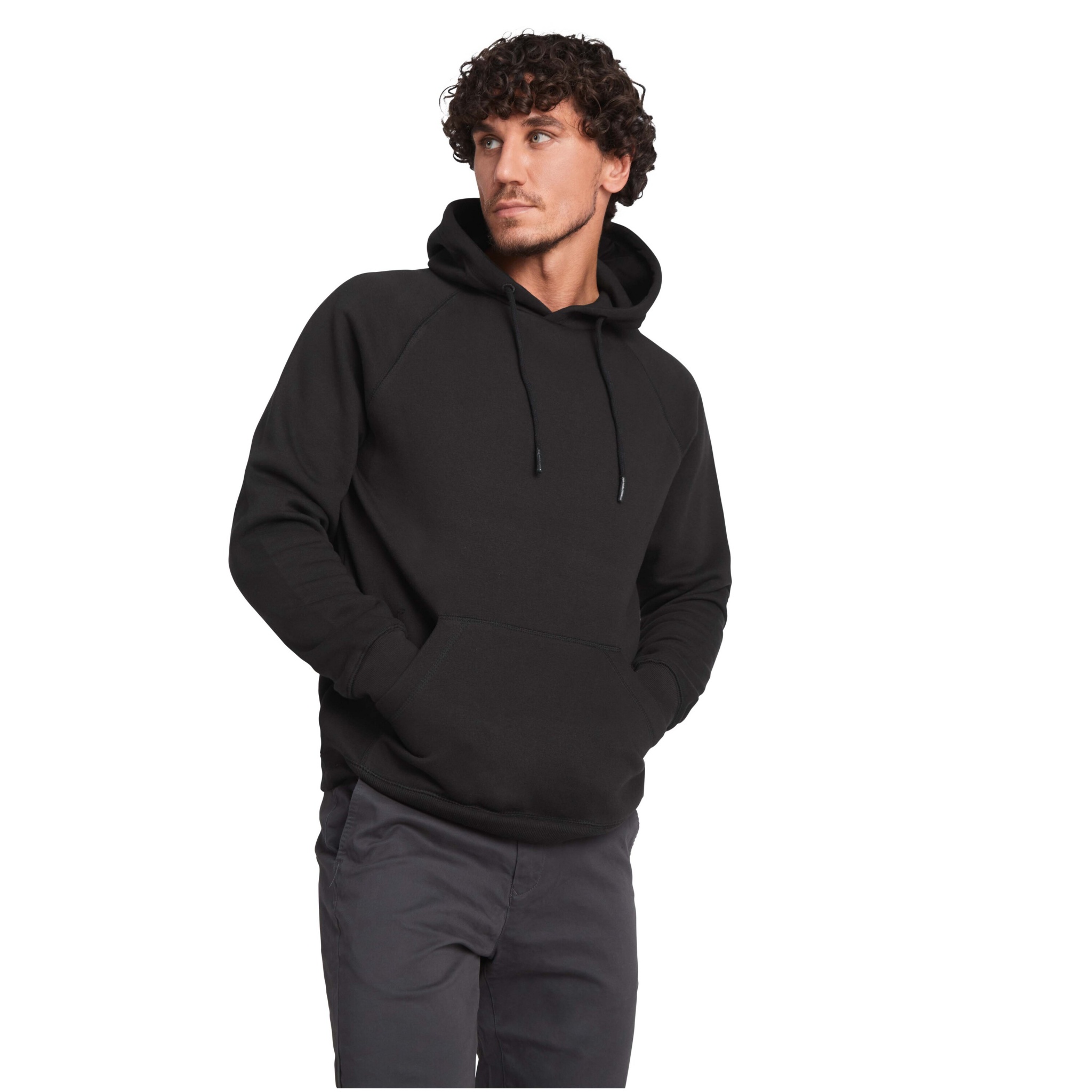 Unisex hoodie in organic cotton and recycled polyester. Kangaroo style pocket. Single jersey lining in hood. Round adjustable drawcord and embroidered eyelets. Cuffs and waistband in 2x1 ribbed fabric. Removable label. Individual recycled packing. The male model is 185 cm and is wearing size L, and the female model is 168 cm and is wearing size S.