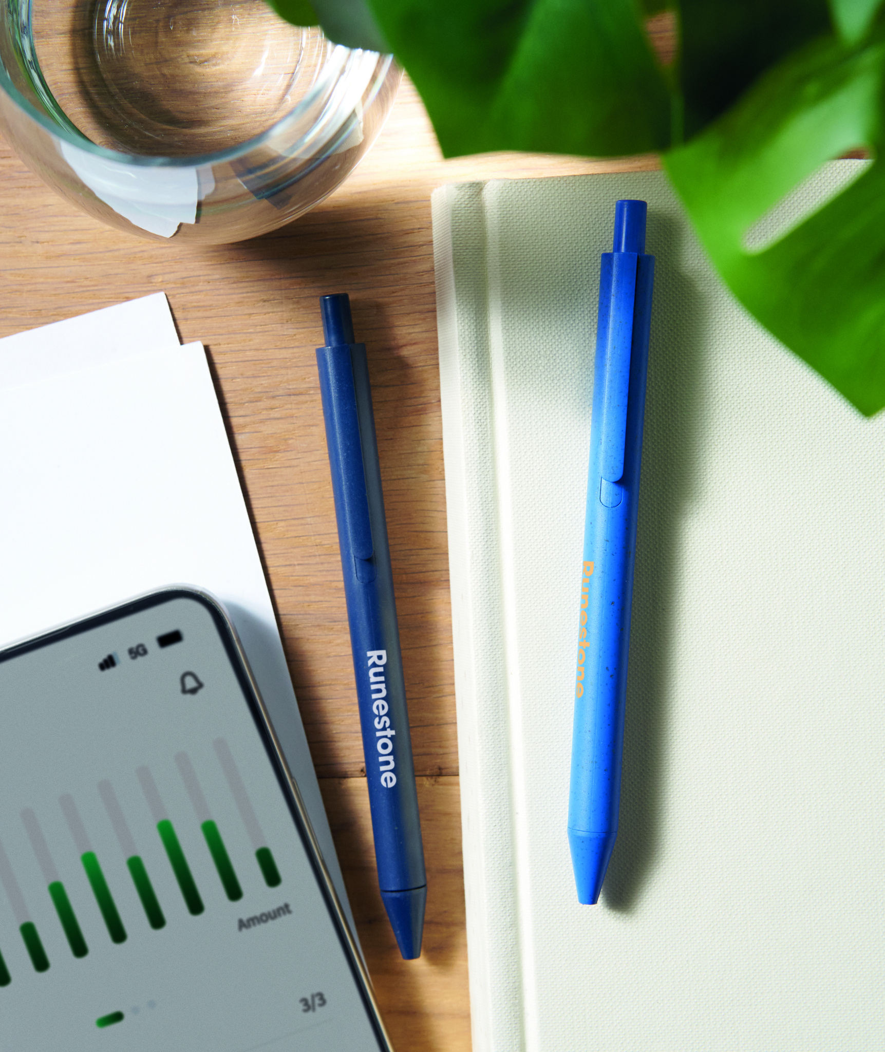 Push button ball pen in wheat straw 50% and ABS 50% material (blue ink).