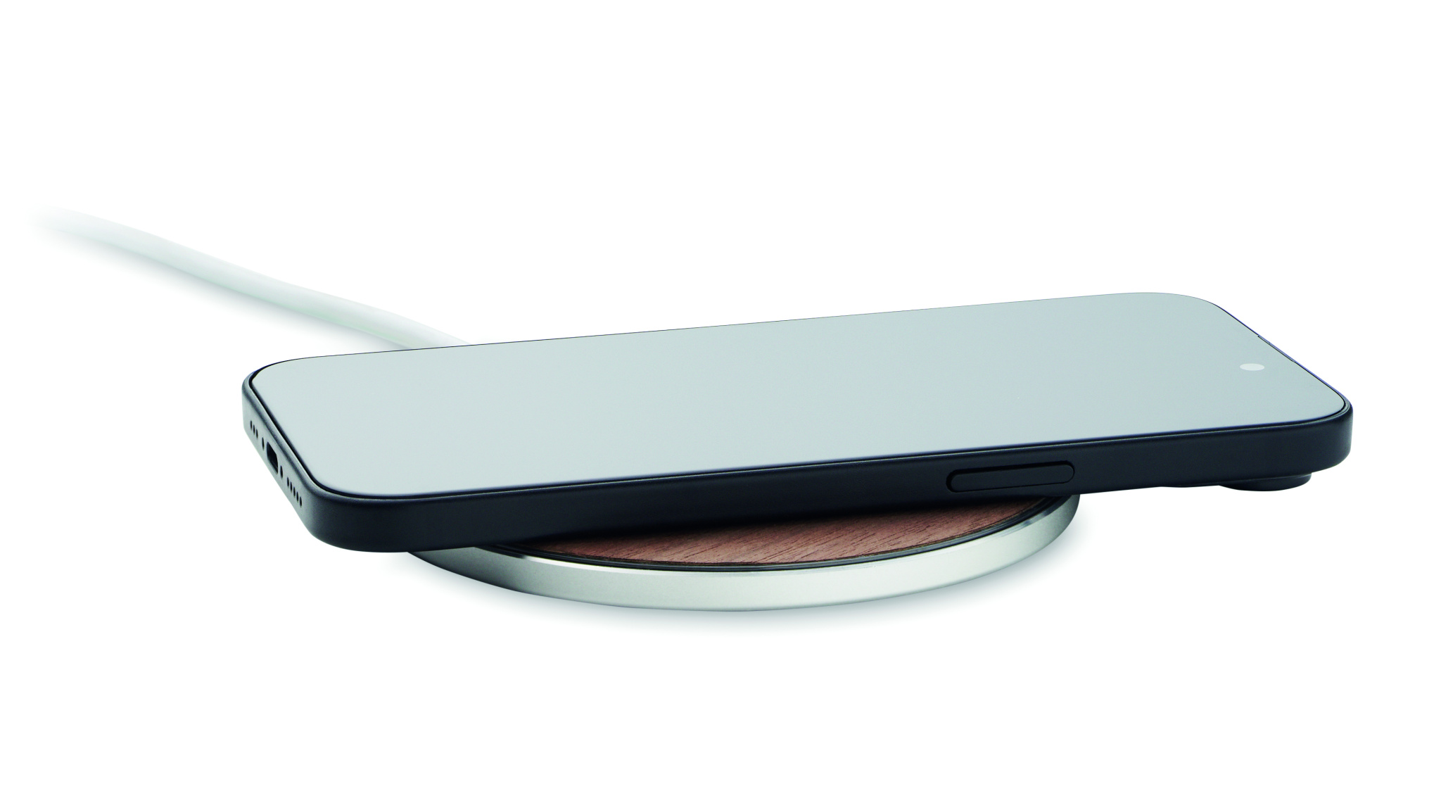 Wireless charger in recycled aluminium with walnut top detail. Connect device to your computer, place smartphone on it and allow it to charge. Output: DC 9V/1.67A (15W). Compatible with all QI enabled devices such as latest Androids, iPhone® 8, X and newer.