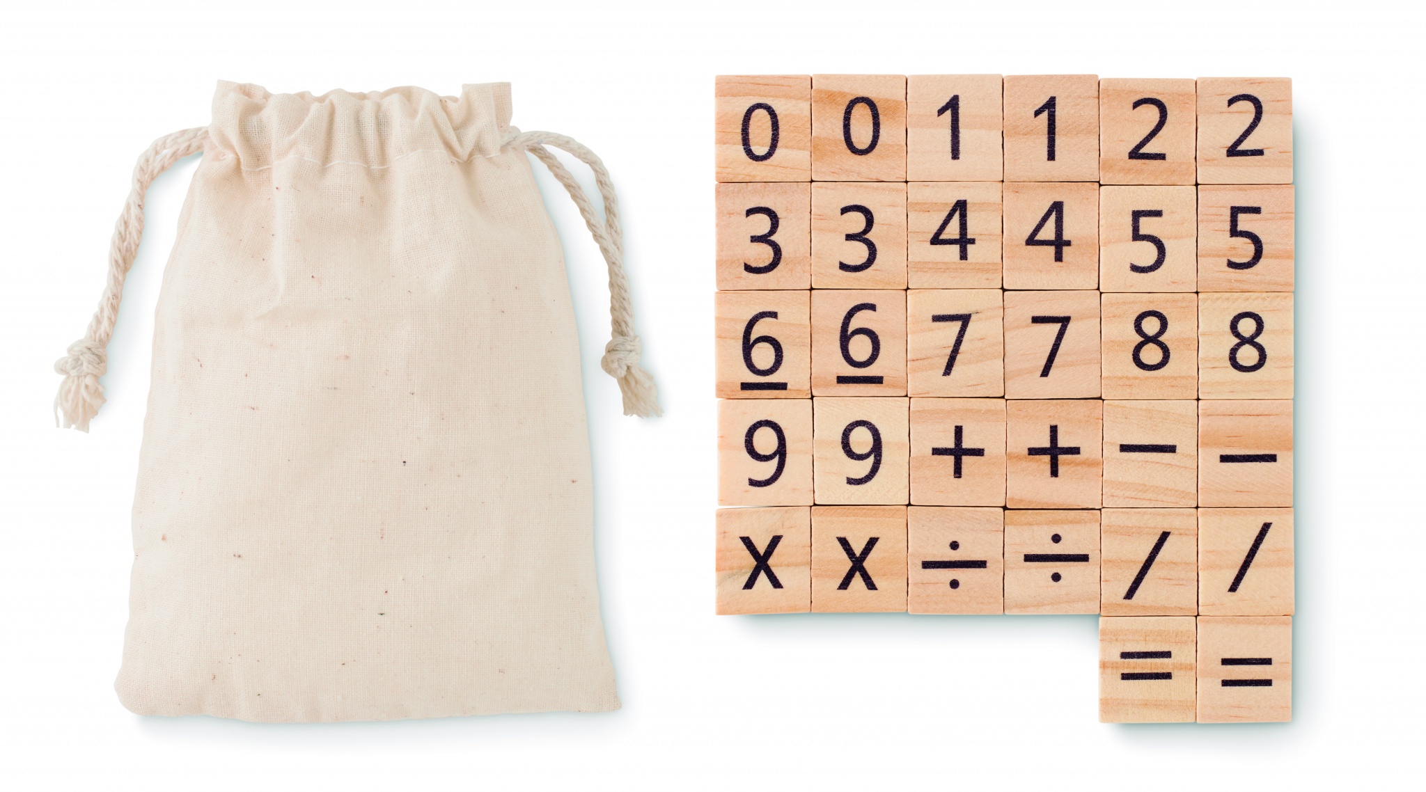 Wood educational counting game in cotton pouch. Includes 32 pieces.