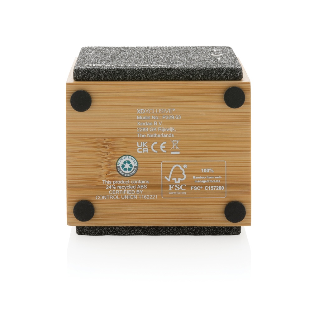 Luxury 5W speaker with clear sound and strong bass. The outer casing is made from FSC 100% certified bamboo. The plastic components are made with RCS (Recycled Claim Standard) certified recycled ABS. Total recycled content: 24 % based on total item weight. RCS certification ensures a completely certified supply chain of the recycled materials. The speaker comes with BT 5.1 for easy and smooth operation up to 10 metres and low power consumption. The 1200 mah battery allows a playtime up to 6 hours and can be fully re-charged in 2 hours. With pick up function and mic to answer (video) calls. Packed if FSC mix kraft box. Including RCS certified recycled TPE charging cable.