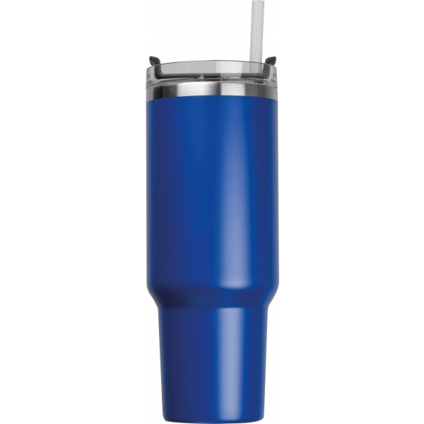 Double-walled XXL drinking cup (capacity approx. 1.2 liters) made of stainless steel with vacuum insulation, including a straw, lid, and handle made of BPA-free plastic. Its narrow bottom design fits into all standard cup holders.