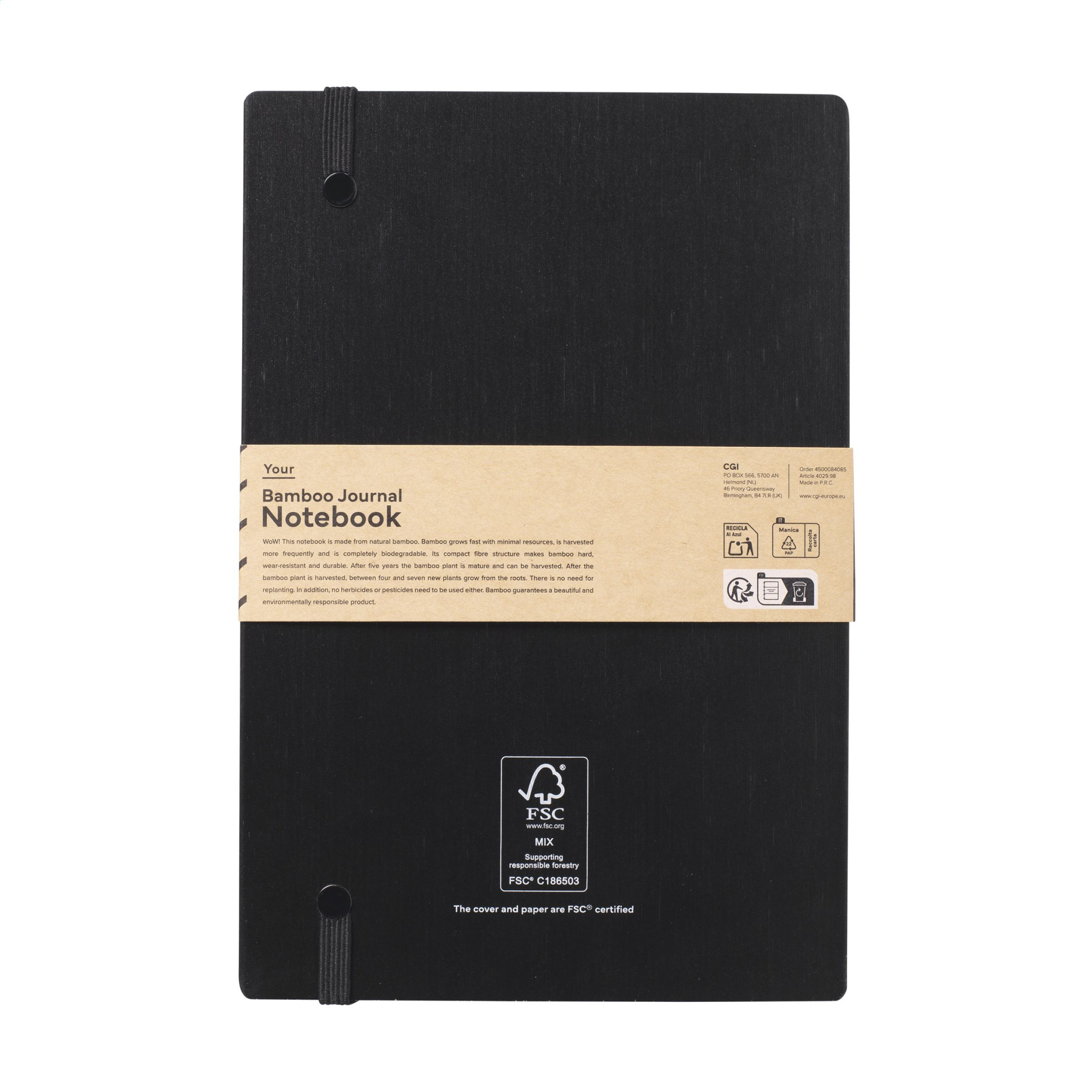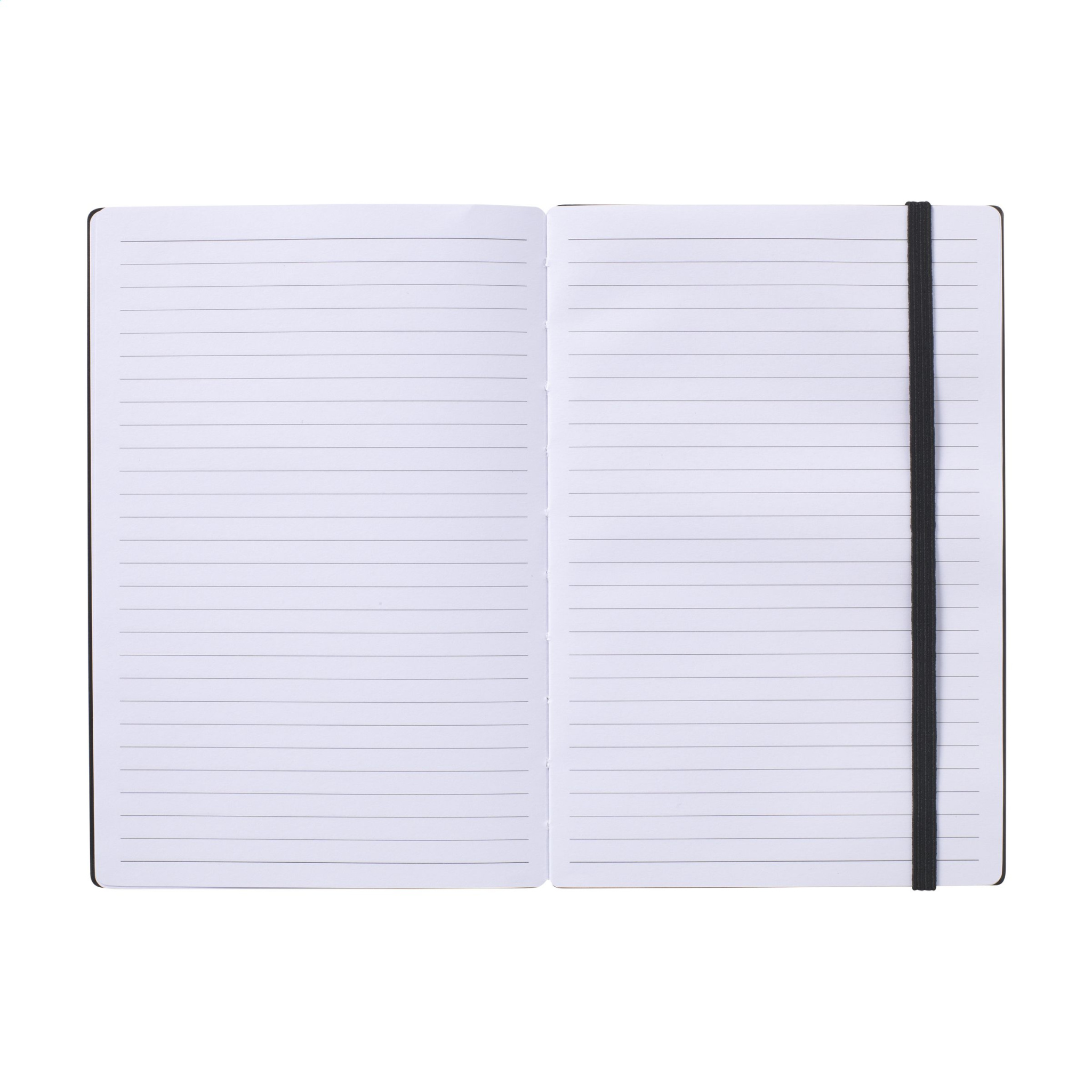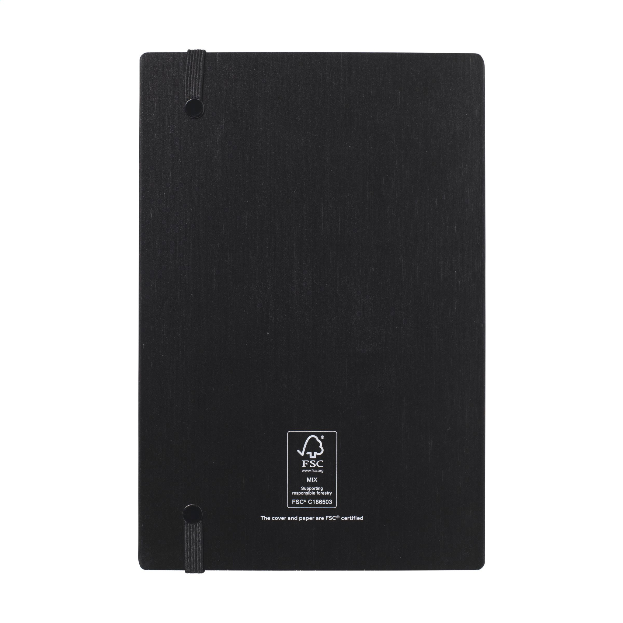 Tugeva, mustaks lakitud FSC 100% sertifitseeritud bambusest kõvakaanega A5-suuruses märkmik. Palja selgrooga köites. See funktsioon on spetsiaalselt loodud selleks, et avatud sülearvuti oleks võimalikult tasasel kohal. See muudab märkmete tegemise ja visandite tegemise palju lihtsamaks. Elastse sulguriga ja u. 96 lehte/192 lehekülge valget, joonelist, FSC Mix sertifikaadiga paberit.