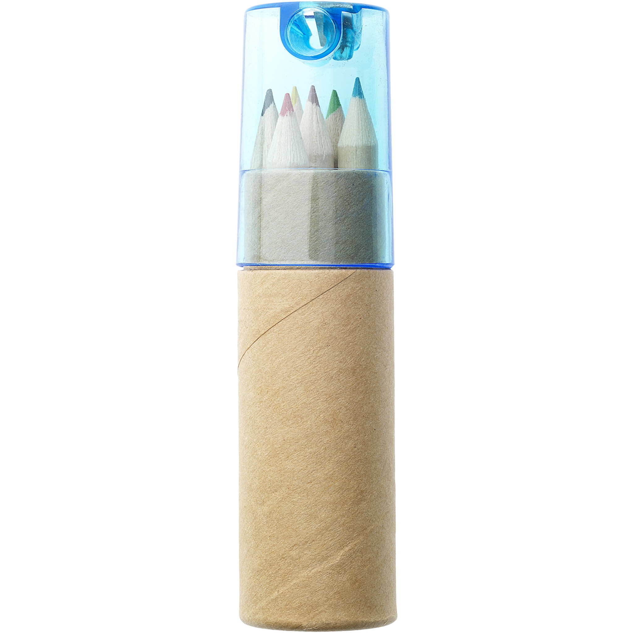 6 värvilist pliiatsit pappsilindriga karbis koos teritajaga plastkaanes. Dekoratsioon pole komponentidel saadaval.