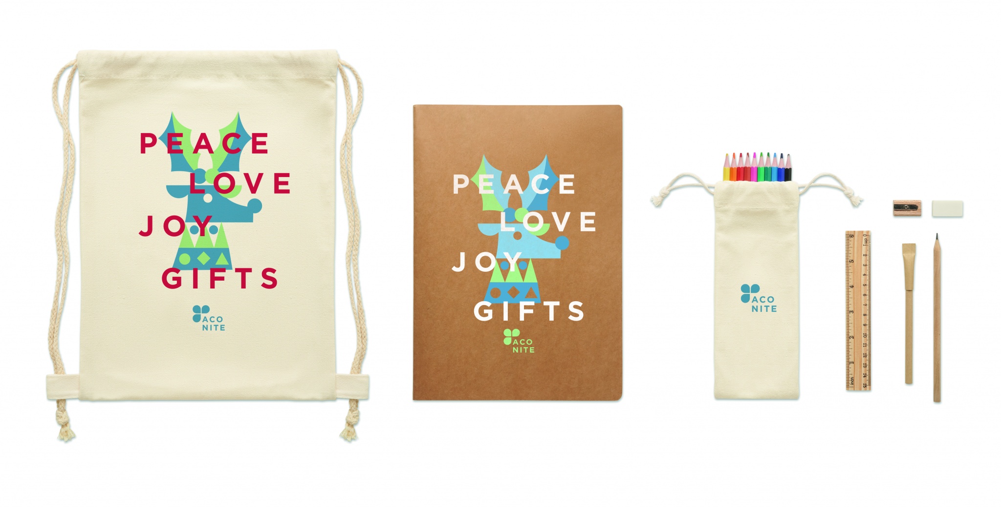 Laste joonistus- ja 5-osaline kirjatarvete komplekt, mis sisaldab puidust joonlauda, puidust teritajat, kustutuskummi, puidust pliiatsit ja papist pastapliiatsit. Lisaks 10 värvipliiatsit, A4 taaskasutatud paber 50 tavalist lehte (100 lehekülge). Esitatakse puuvillases nööriga kotis.