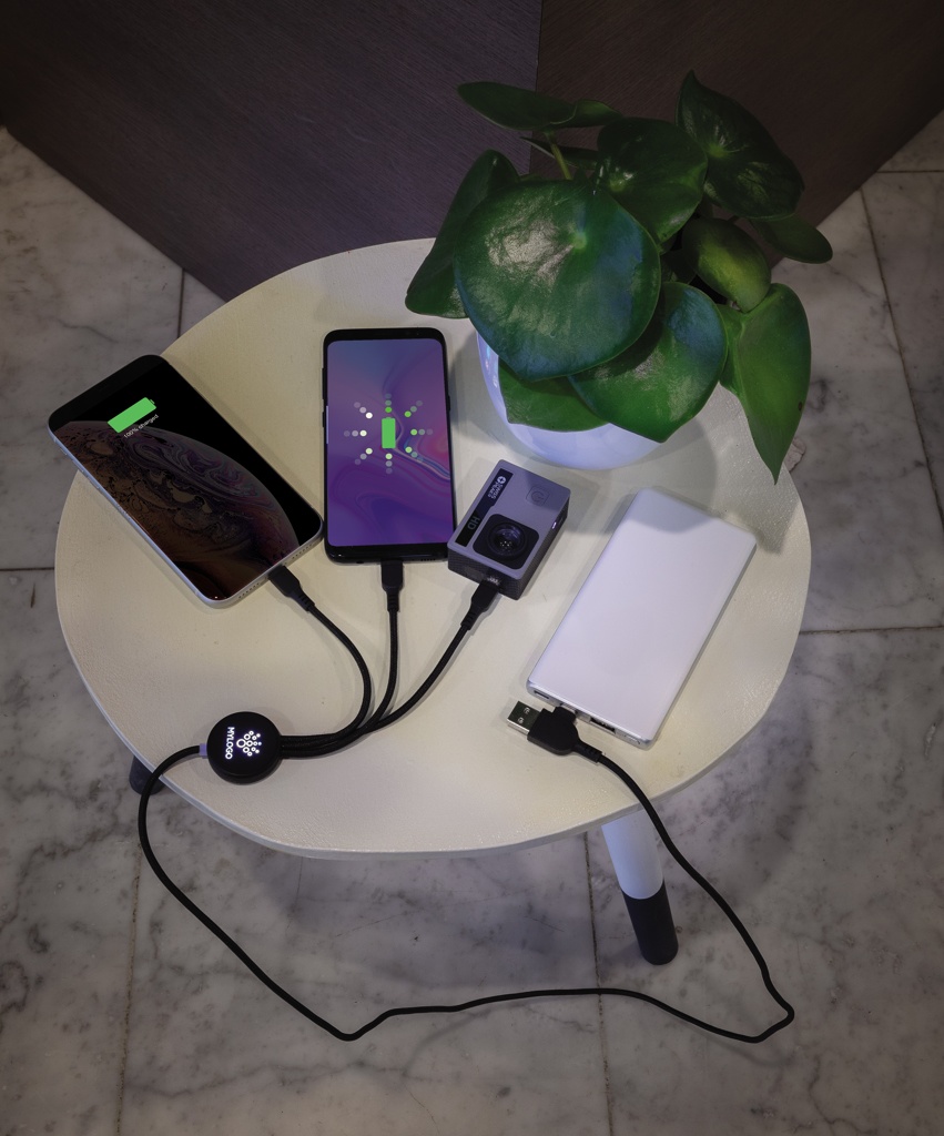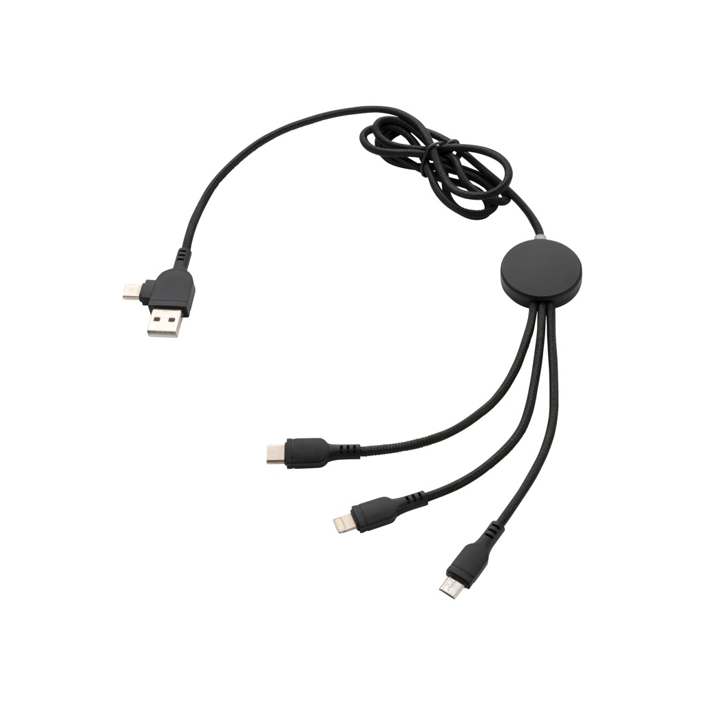 Punutud nailonist multikaabel 5 erineva pistikuga: USB C-sisend, USB-A-sisend, C-tüüpi väljund, IOS-väljund ja mikro-USB-väljund. See võimaldab kasutada kaablit ka C-tüüpi väljundseadmetega, mis on kaasas uuema põlvkonna telefonidele ja macbook arvutitele. Kaablil on ka USB A väljundsisend, nii et sellega saab laadida mis tahes seadet mis tahes väljundallikast. ABS-korpus, millel on võimalus graveerida oma logo, mis süttib kaabli kasutamisel. PVC vaba. Pikkus 120 cm.