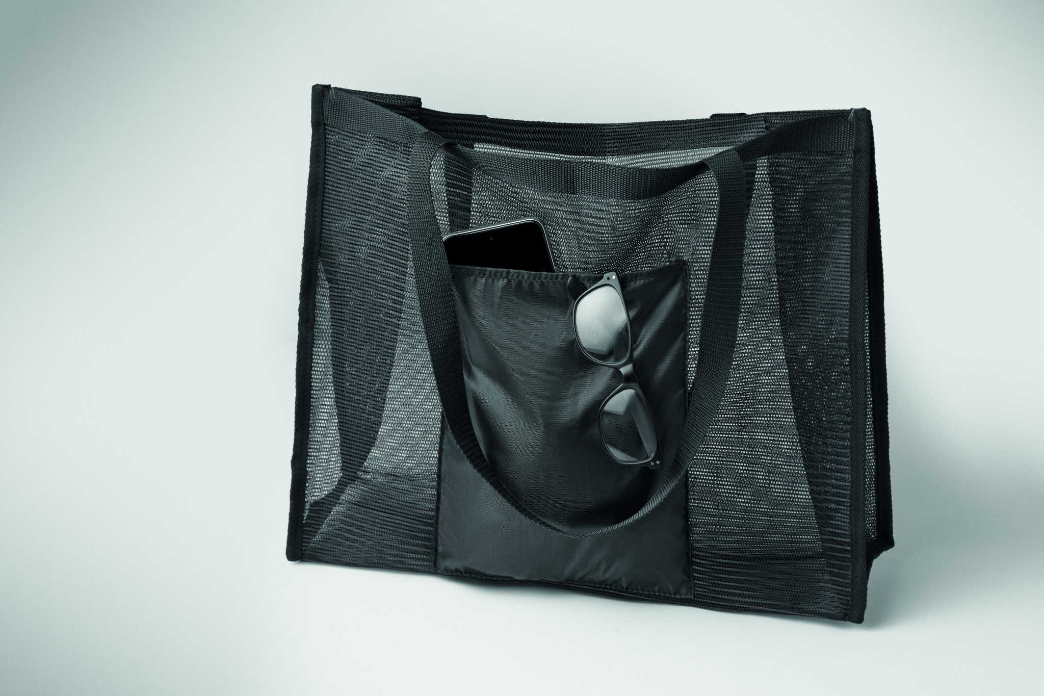 RPET võrgust ja 210D RPET-ist lühikeste sangadega ostukott. Suure avatud esitaskuga. Mahutavus 20 l, kandevõime kuni 10 kg.
