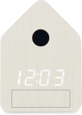 Väike MDF-ist lauakell sisseehitatud äratuskellaga, millel on käo hääl, koos temperatuurinäidikuga. Käo hääl iga täistunni ja äratuse ajal. Valge LED-ekraan. Heli vaigistatakse automaatselt kella 22.00 ja 06.00 vahel. 5-minutilised edasilükkamise intervallid.