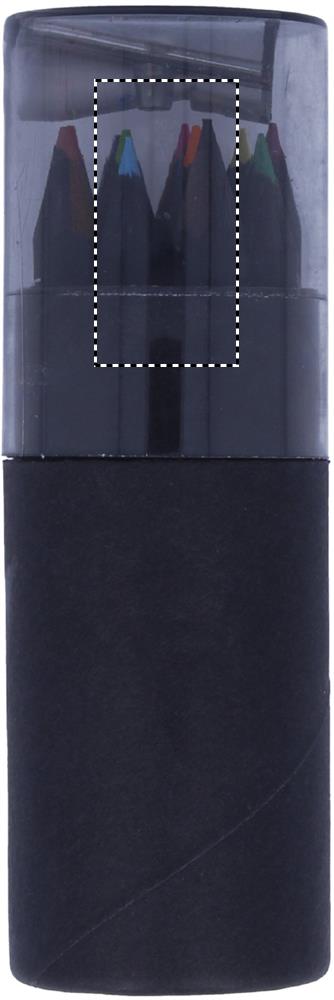See musta värvi paberist torukarp sisaldab 12 värvipliiatsit ja karbi kaanes pliiatsiteritajat.