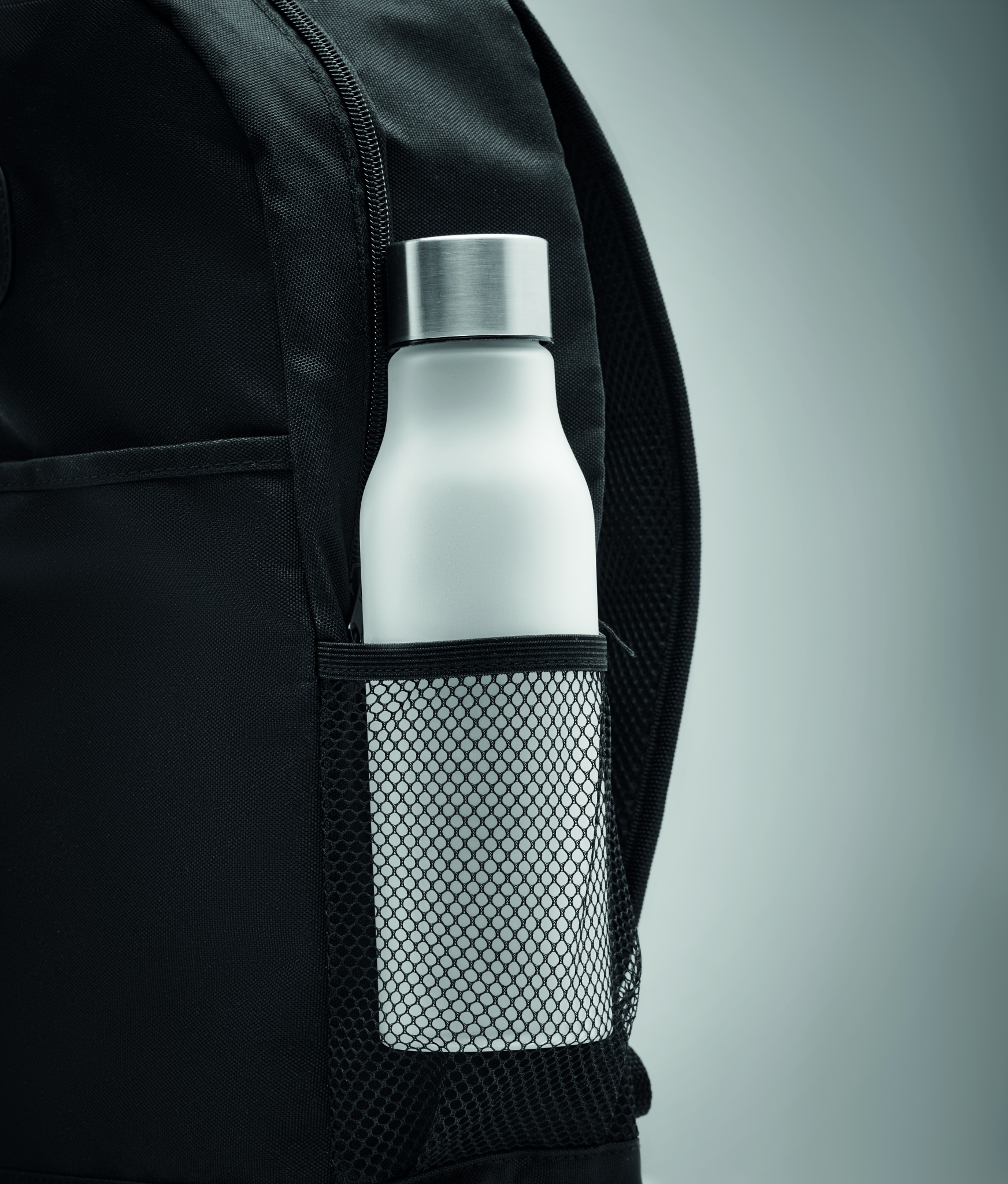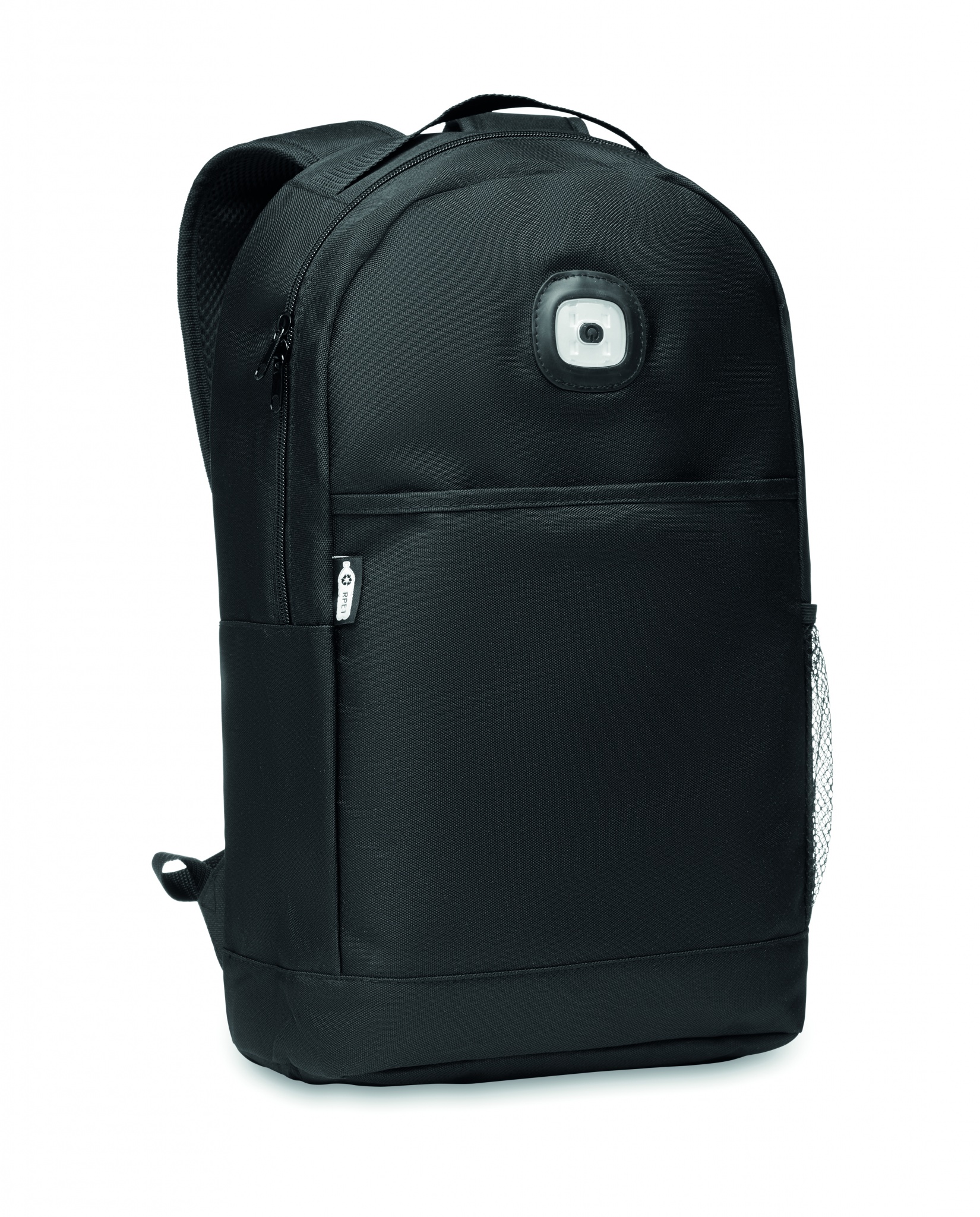 600D RPET-ist seljakott, mille esipaneelil on eemaldatav COB-valgusti. Valge COB-valgusti 3 erineva valguse heleduse seadistusega. Haagi ja aasaga suletav esitasku. Küljel võrktasku. Komplektis nööpatarei.