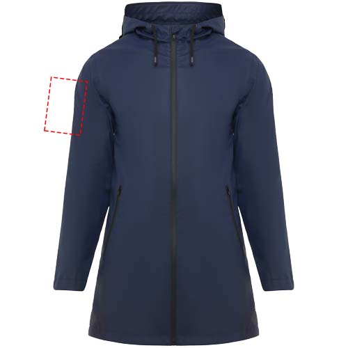 Veekindel vihmamantel naistele. Kapuuts tipuga. Kuumkinnitusega lukud ja õmblused. Must kontrastsed detailid. Kaks lukuga küljetaskut. Tagaäärel lõhik. Eemaldatav etikett. Veekindel. Modell on 179 cm pikk ja kannab suurust S.