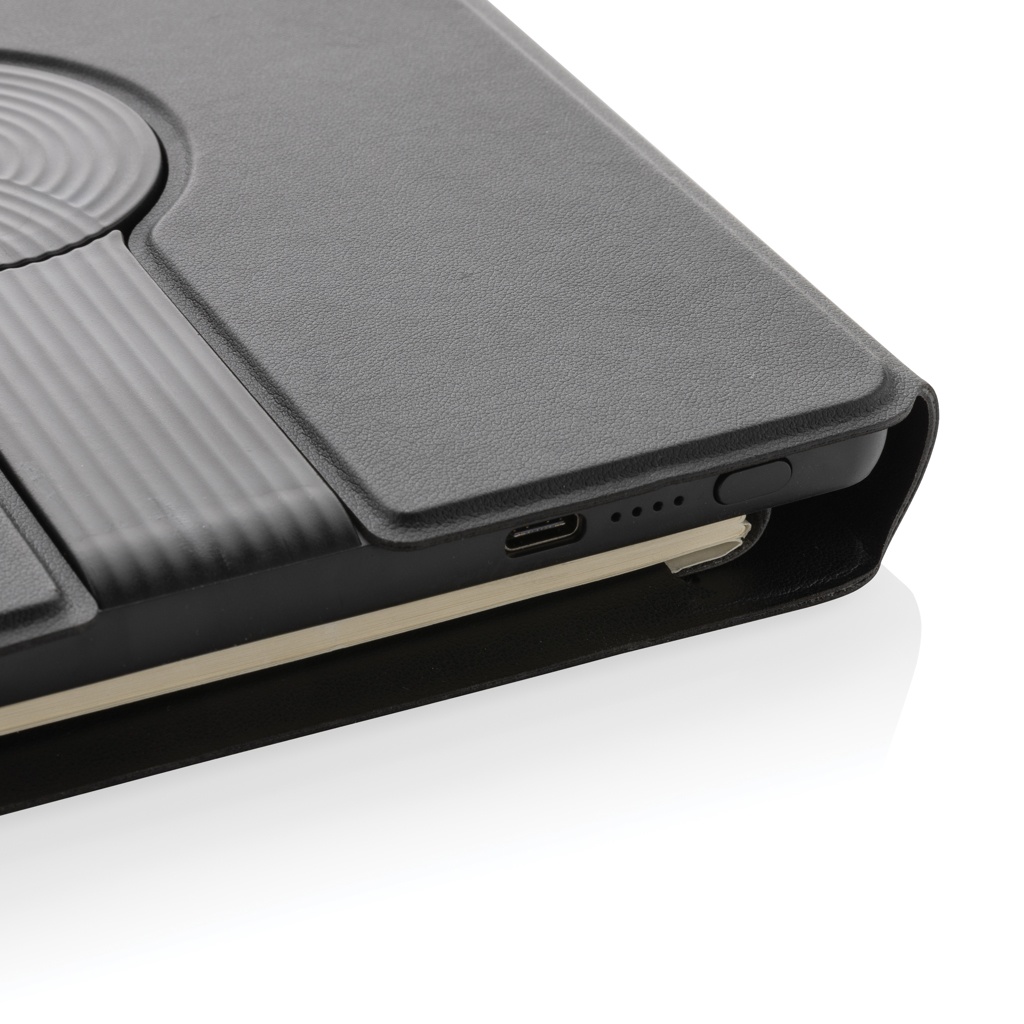 Laadige oma mobiiltelefoni ja kella (ainult Apple'i kellad) juhtmevabalt täiskiirusel selle A5 PU materjalist sülearvutiga. Luksuslik ja kokkupandav kaks-ühes juhtmevaba laadija, mis on valmistatud RCS-sertifikaadiga taaskasutatud PU-st. Taaskasutatud kogusisaldus: 8% eseme kogukaalust. RCS-sertifikaat tagab taaskasutatud materjalide täielikult sertifitseeritud tarneahela. Kinnitage telefon (iPhone 12 või uuem) juhtmevaba laadija külge ja telefon joondub ideaalselt sees olevate magnetitega. 10 W juhtmevaba laadija ühildub kõigi QI-seadmetega (Iphone 8 ja uuemad ning Android-seadmed). Integreeritud 5000 mAh A-klassi akuga. Märkmik sisaldab 64 lehte/128 lehekülge 80 gsm joonega FSC® paberit.