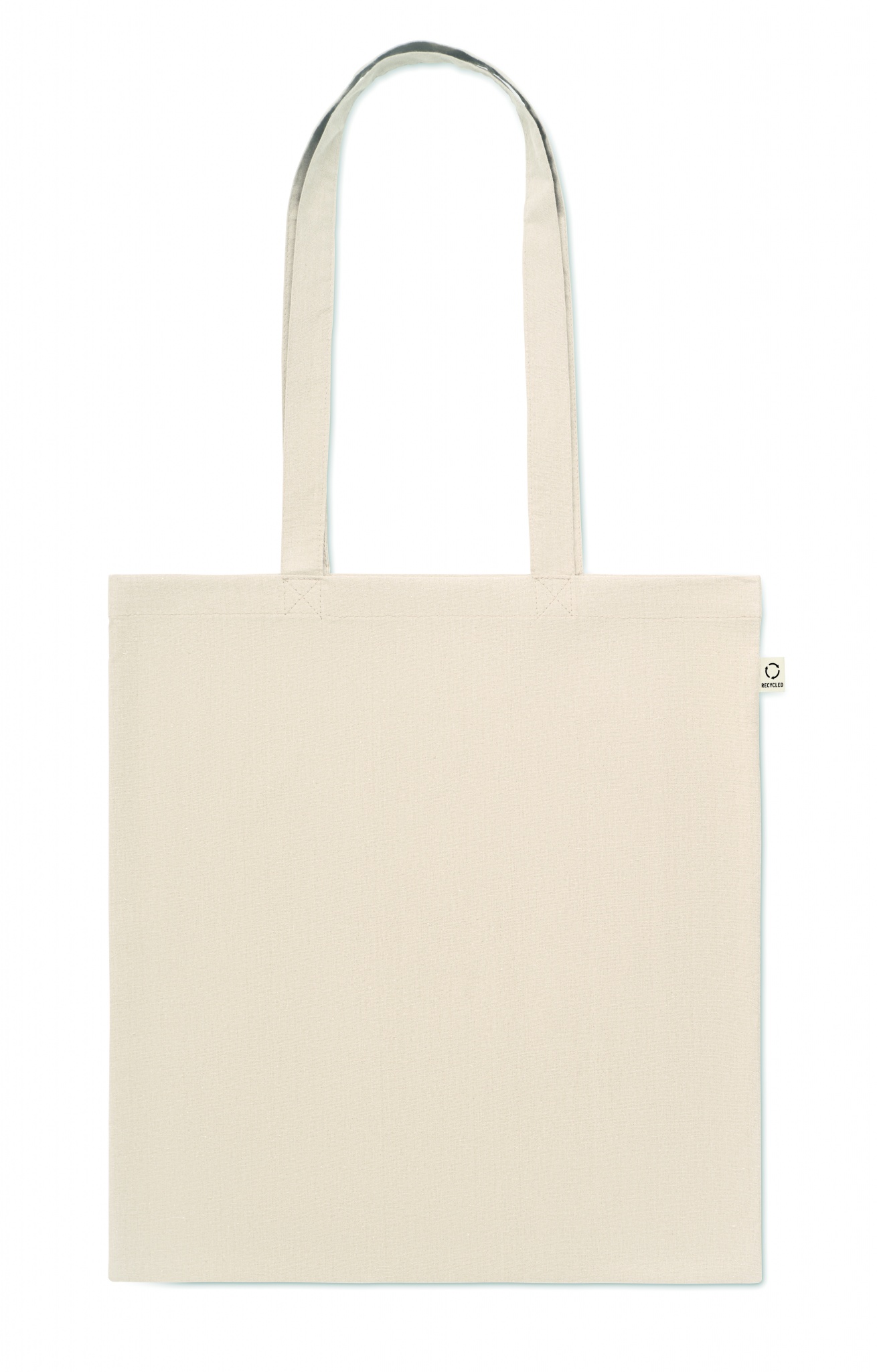 Tarbimiseelsest taaskasutatud puuvillasest ostukott (70% taaskasutatud puuvill ja 30% RPET) pikkade sangadega. 140 gr/m².