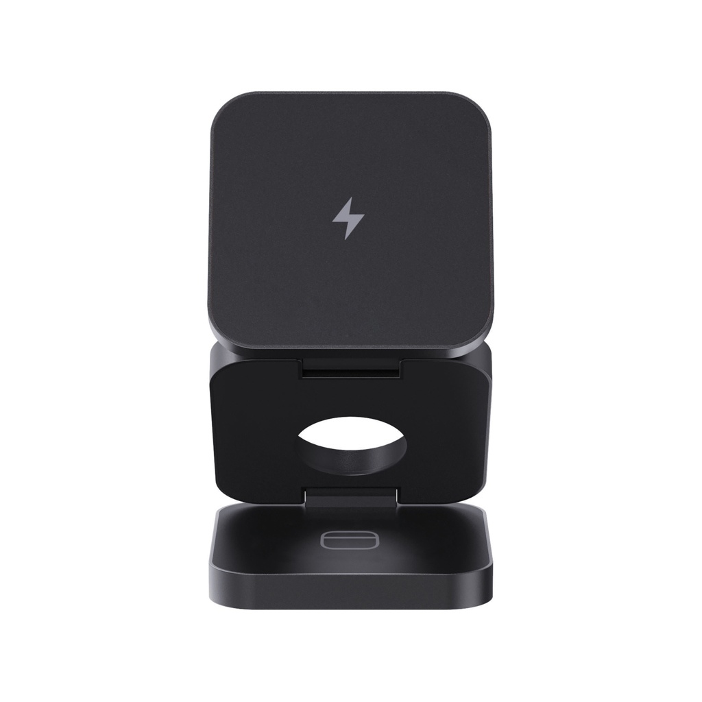 Luksuslik ja kokkupandav kolm-ühes juhtmevaba laadija, mis on valmistatud RCS-i ringlussevõetud ABS-ist ja RCS-i ringlussevõetud alumiiniumist. Taaskasutatud kogusisaldus: 46% eseme kogukaalust. RCS-sertifikaat tagab taaskasutatud materjalide täielikult sertifitseeritud tarneahela. Juhtmeta laadija on varustatud magnetilise 15 W juhtmevaba laadija ja täiendava 5 W juhtmevaba laadijaga, mis sobib kõrvaklappide või muude väikeste juhtmevabade laetavate seadmete jaoks ning 2,5 W juhtmevaba laadijaga nutikellade jaoks (ainult Apple'i kellad). Sisaldab RCS-sertifikaadiga 120 cm taaskasutatud TPE-kaablit. Pakitud FSC® mix kraft pakendisse. Toode ja tarvikud 100% PVC-vaba. Sisend: 9V/3A optimaalseks kasutamiseks. Väljund: Telefon: 9V/1.1A; 9V/1,67 A/(15W), kõrvaklapid: 5V/1A (5W), käekell: 5V/0,5A. PVC vaba.