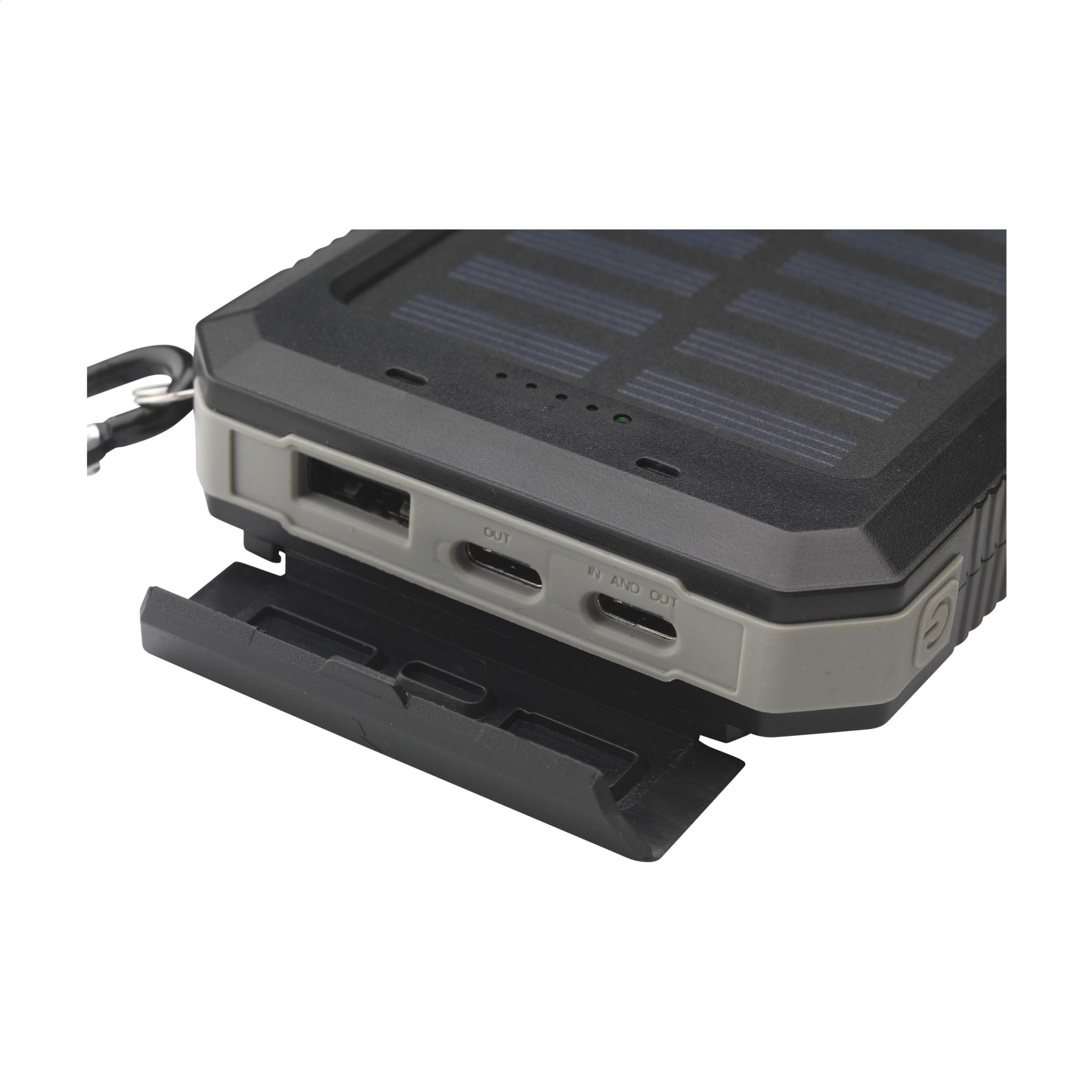 Tugev välistingimustes töötav päikesepatarei 8000 mAh akupank, mille korpus on valmistatud ümbertöödeldud ABS-st ja mille nurkades on silikoonist kaitsvad servad. Sisaldab päikesepaneeli, integreeritud kompassi, LED-indikaatortulesid, LED-taskulampi ja karabiini. Pritsmekindel ja tolmukindel. Sobib enamlevinud nutitelefonide ja muude seadmete laadimiseks. Sisend: Type-C DC5V/2.1A. Väljund: Type-C DC5V/2.1A. 1 x USB-A port ja 2 x USB-C port. Päikeseenergia sisend: 200 mAh. Laadimisaeg päikeseenergial umbes 40 tundi. Saab laadida vooluvõrgust või päikesepaneelist. Ideaalne mitmekülgne laadija õues tegutsemiseks. Kaasas USB-C/USB-C laadimiskaabel ja kasutusjuhend. RCS-sertifikaadiga. Taaskasutatud materjal kokku: 17%. Iga ese on eraldi karbis.
