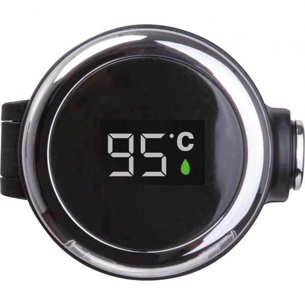 Vaakumisolatsiooniga roostevabast terasest pudel, millel on korgi sees temperatuurinäidik ja turvalukk. Maksimaalse temperatuuri näidik: 99 °C.