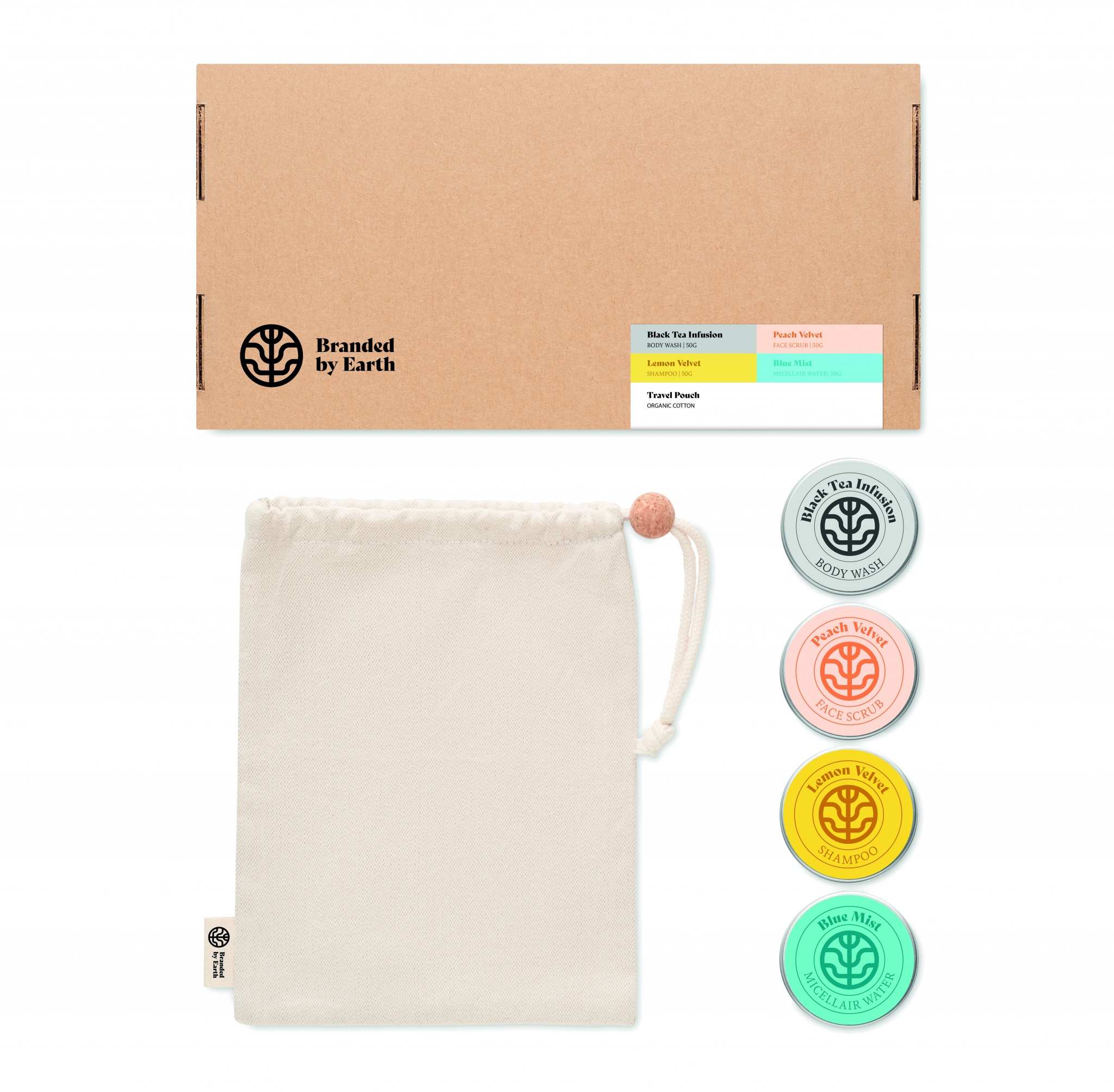Unisex reisikinkekomplekt firmalt Branded By Earth. Sisaldab vegan 50gr kehapesuvahendit, šampooni, näokoorijat, mitsellaarveekotti ja orgaanilisest puuvillast reisikotti. Kõik tükid pakitud purki. Esitatakse taaskasutatud paberist karbis. Valmistatud EL-is.