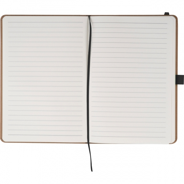Kierrätyspaperista valmistettu A5-kokoinen muistikirja, jossa on 160 viivoitettua sivua, kirjanmerkki ja kynänlenkki, jonka väri on sovitettu joustavaan sulkunauhaan. Logosi on painettu kannen ulkopuolelle.
