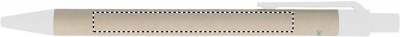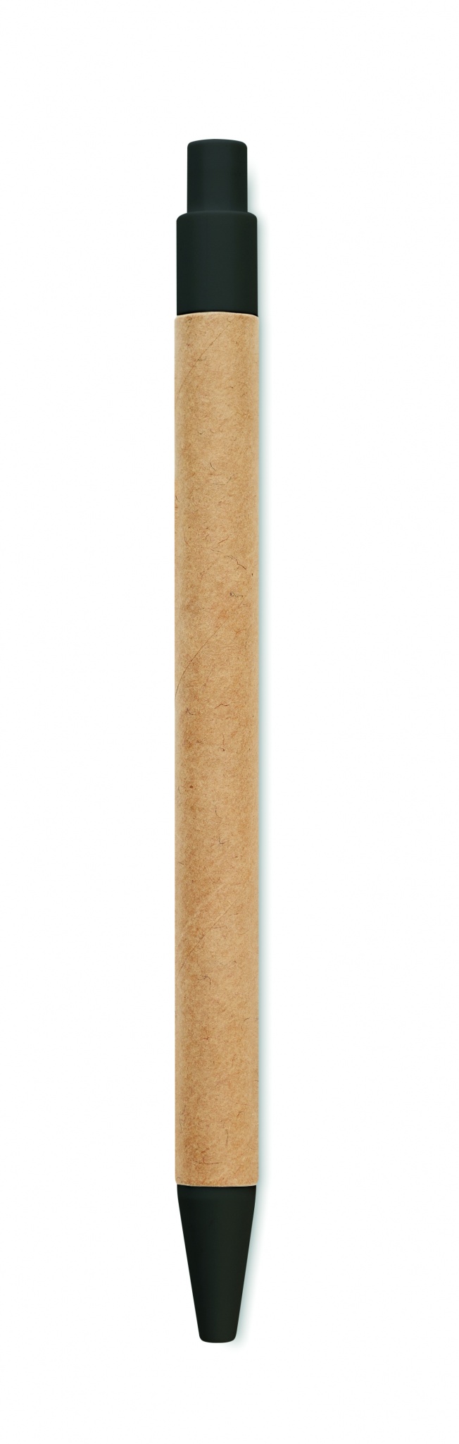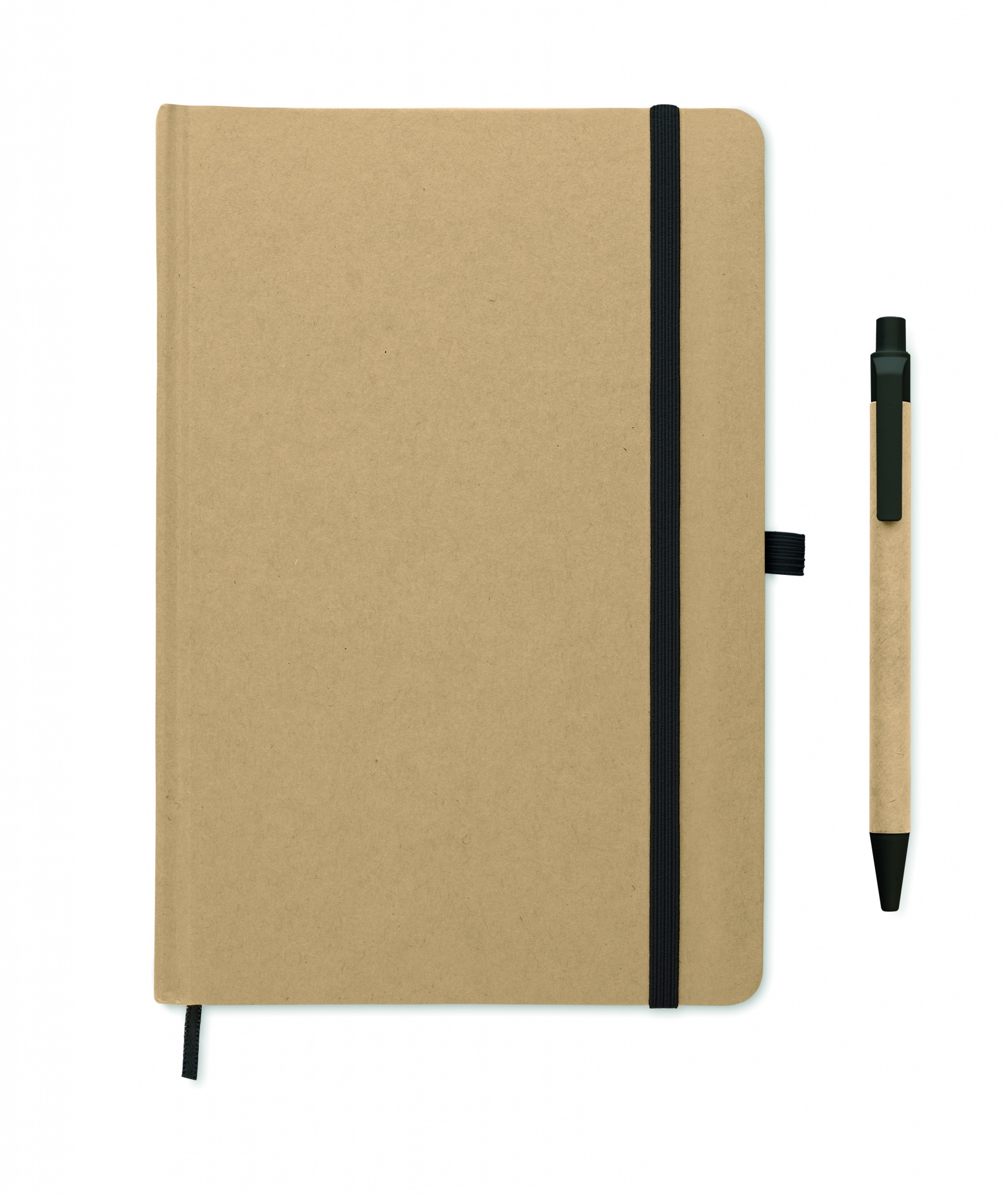 A5-muistikirja, jossa on kova kierrätyskartonkikansi. 160 viivoitettua sivua (80 arkkia kierrätyspaperia). Joustava sulkuhihna ja kynälenkki, nauhallinen kirjanmerkki. Mukana painonappikuulakynä, jonka runko on kierrätyspaperia. Sininen muste.