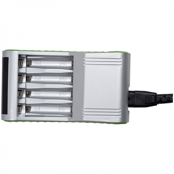 Tämä akkulaturi on todellinen innovaatio. Voit ladata ja käyttää uudelleen jopa 4 alkaliparistoa (AA / AAA alkaliparistoa) tai jopa NiMH-akkua kahdessa tunnissa. Sisältää virtapistokkeen. Painamme logosi hopeapinnalle.