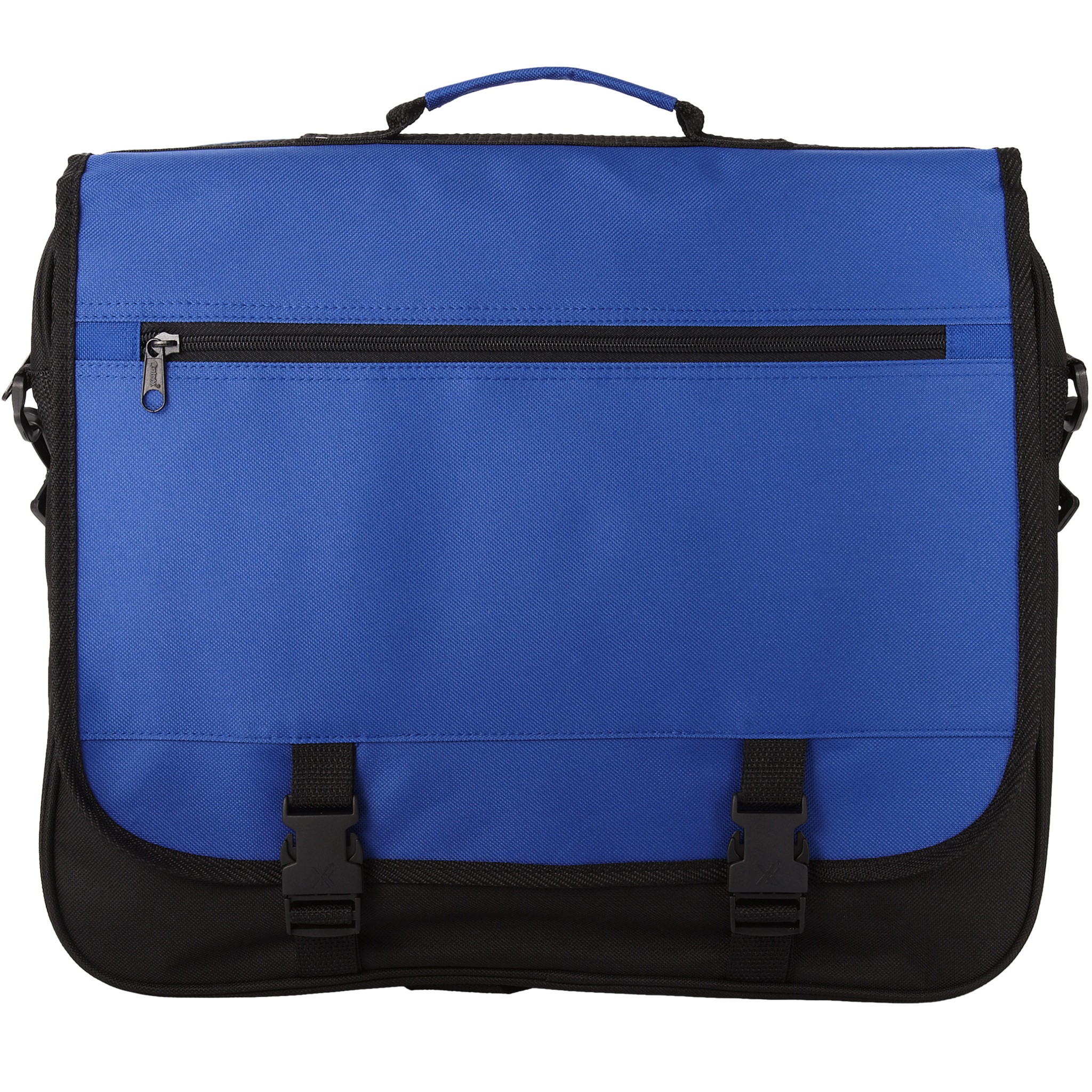 Laukku, jossa on säädettävä olkahihna, kiinnityssolki, läpässä vetoketjullinen tasku, vetoketjullinen säilytyslokero ja läpän alla useita avoimia taskuja.