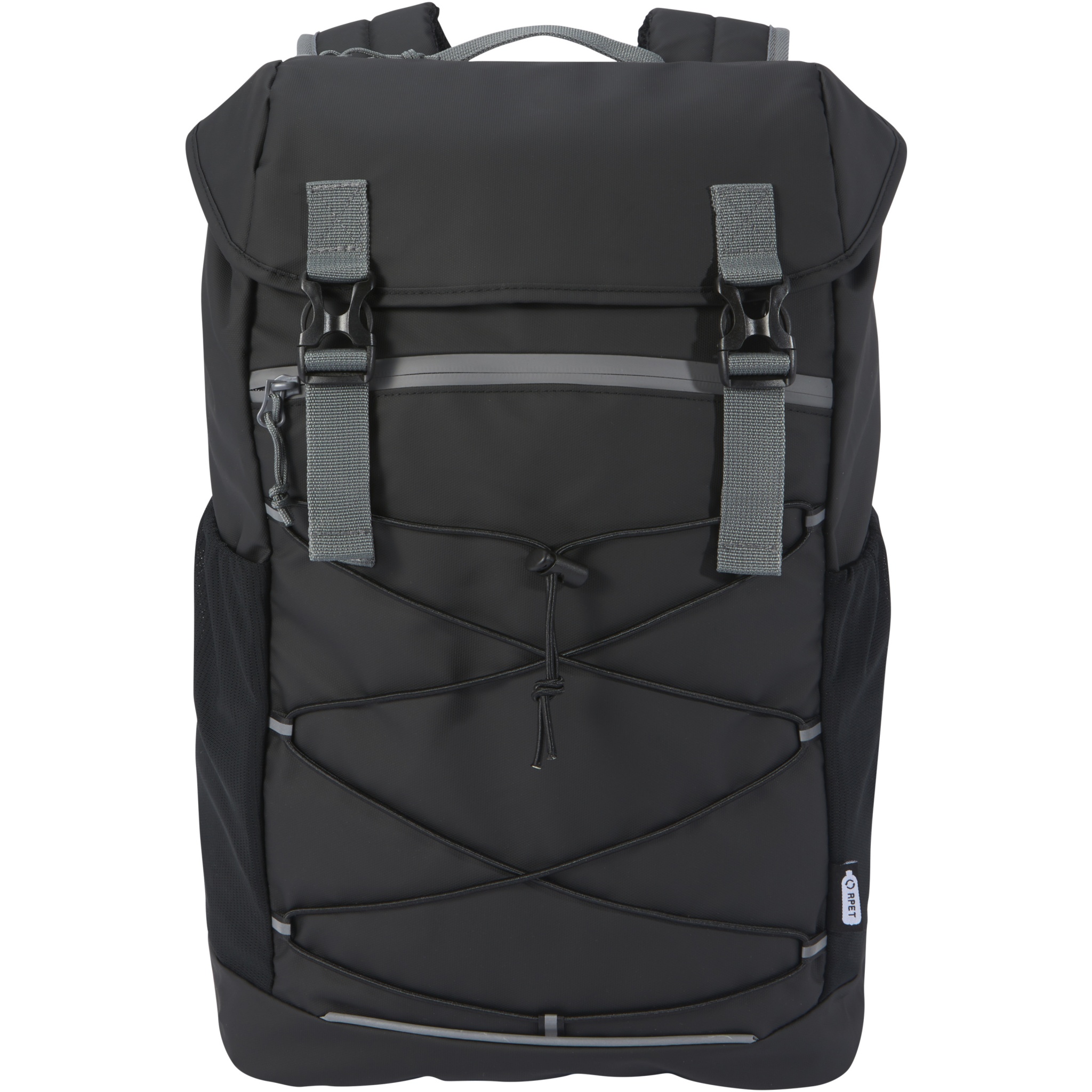 Vedenkestävä reppu kannettavalle tietokoneelle. Repun osat, mukaan lukien vetoketjut, on valmistettu GRS-sertifioiduista kierrätysmateriaaleista. Repussa on tilava lokero 15,6-tuumaiselle kannettavalle tietokoneelle, kiristysnyöri ja säädettävät soljet, jotka maksimoivat säilytystilan läppäkannen alla. Repussa on useita taskuja, kuten vetoketjullinen etutasku, jossa on joustavat kiristysnyörit tavaroiden säilytystä ja järjestyksessä pitämistä varten sekä heijastava kaistale näkyvyyttä varten. Pehmustetun selkäosan ja rinnan yli kulkevan säädettävän hihnan ansiosta reppua on mukava kantaa silloinkin, kun se on täynnä. Repun kangas, vuori, nauha ja vetoketjut on valmistettu GRS-kierrätysmateriaaleista. Tilavuus: 23 litraa. PVC-vapaa.