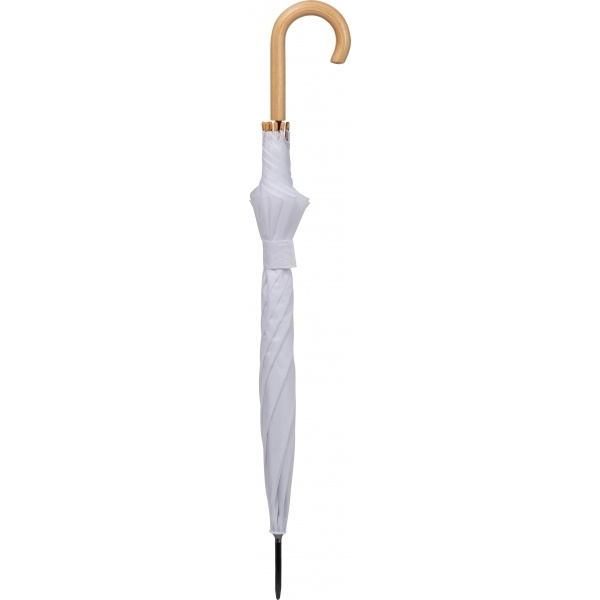Automaattinen sateenvarjo 190T polyesterista kaareva puinen kahva ja puiset kärjet. Logosi painetaan yhden segmentin alaosaan.