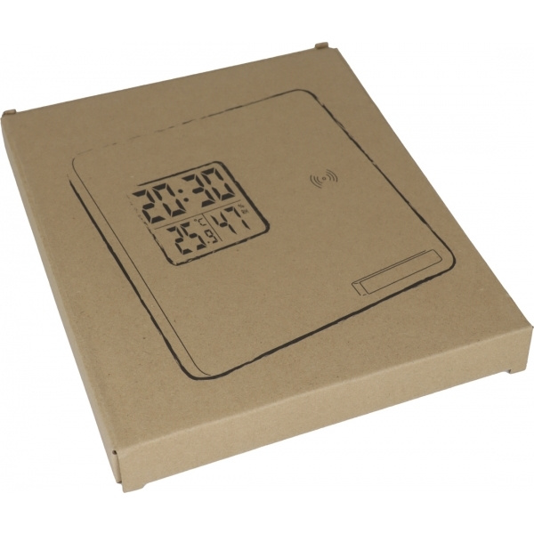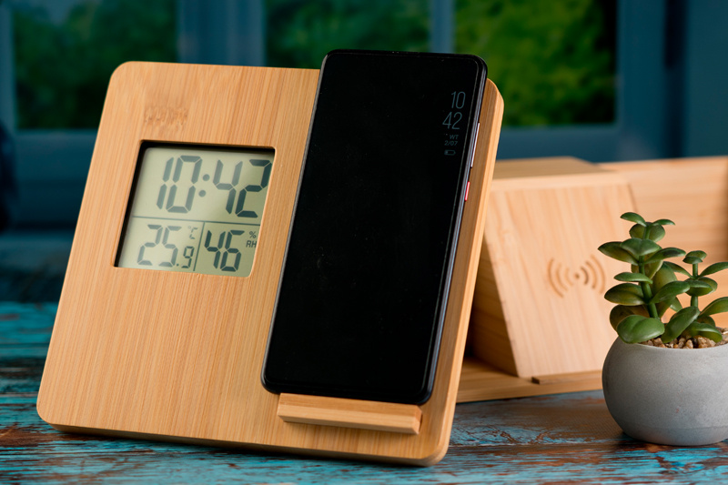 Bambu sääasema / langaton laturi digitaalisella näytöllä, joka näyttää lämpötilan, kosteuden ja ajan. Tarjoaa vakaan jalustan. Logosi kaiverretaan etupuolelle.