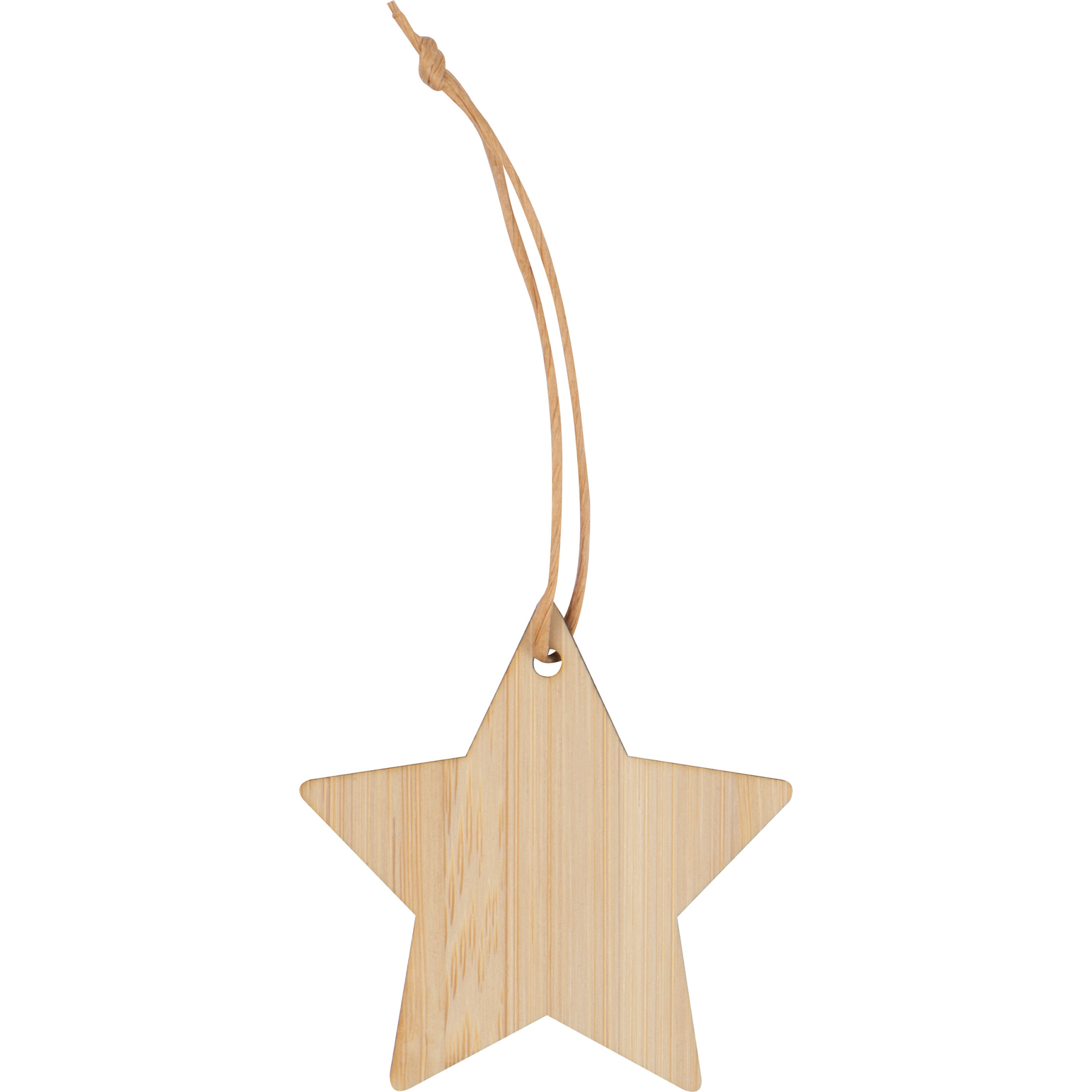Tähden muotoinen joulu- tai koristeriipus bambusta ripustuslenkillä. Logosi kaiverretaan tähteen.