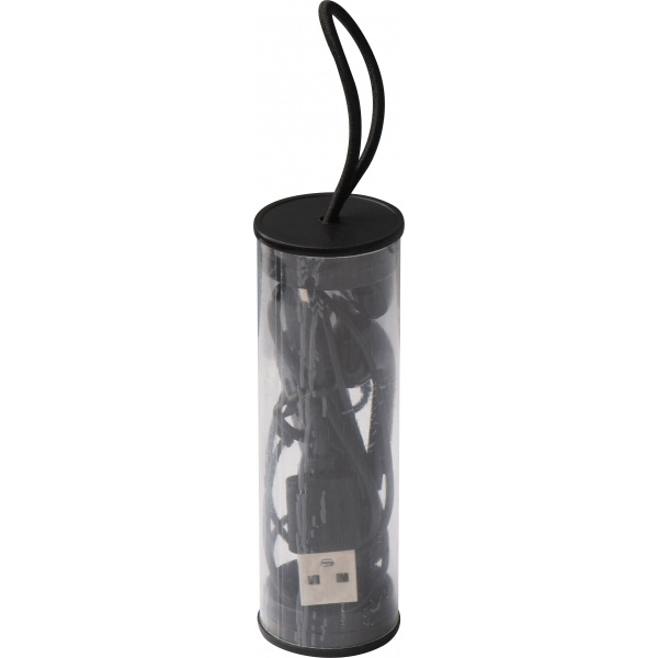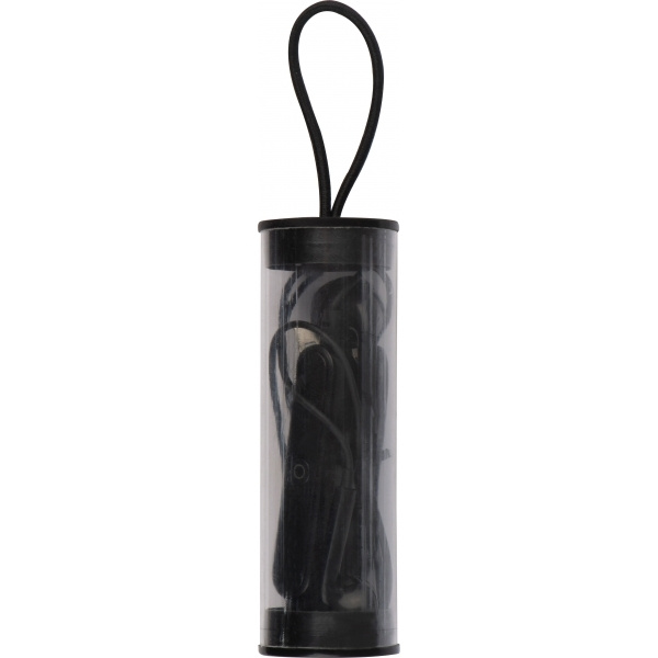 Bluetooth-kuulokkeet äänenvoimakkuuden säätimellä ja USB-latauskaapelilla muovikotelossa ripustuslenkillä. Painamme logosi koteloon.