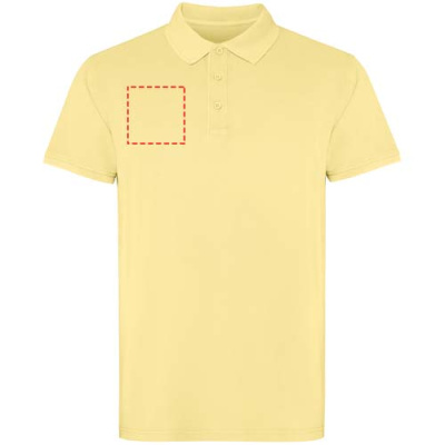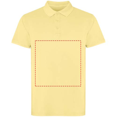 Lyhythihainen unisex-poolopaita. Happopesuviimeistely. Uurrettu 1 x 1 -kaulus ja hihansuut, sivuhalkiot. Sävy sävyyn -peitetikkaus. Napituslista, jossa kolme nappia.