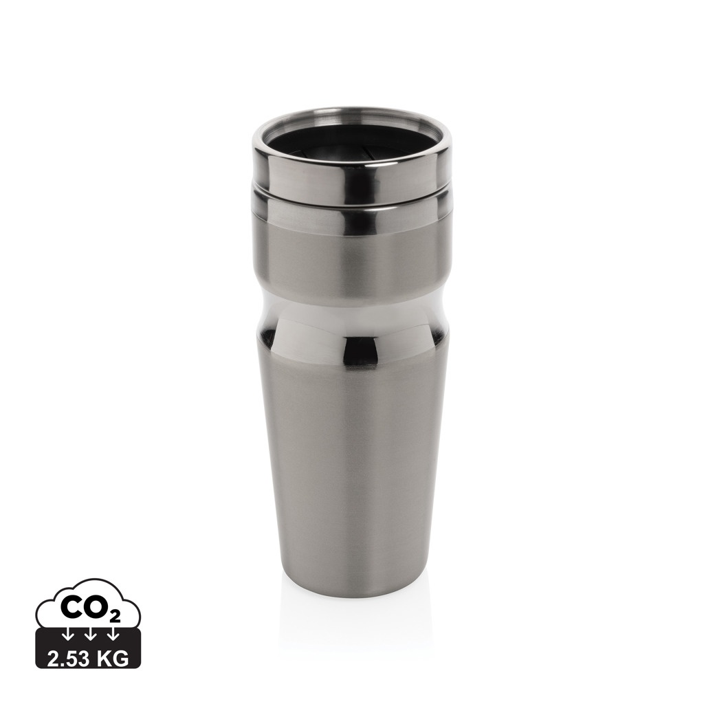 350 ml kaksiseinäinen juomamuki ruostumattomasta teräksestä, ruostumaton teräskansi, sulkumekanismi vuotamisen estämiseksi. Rekisteröity design®