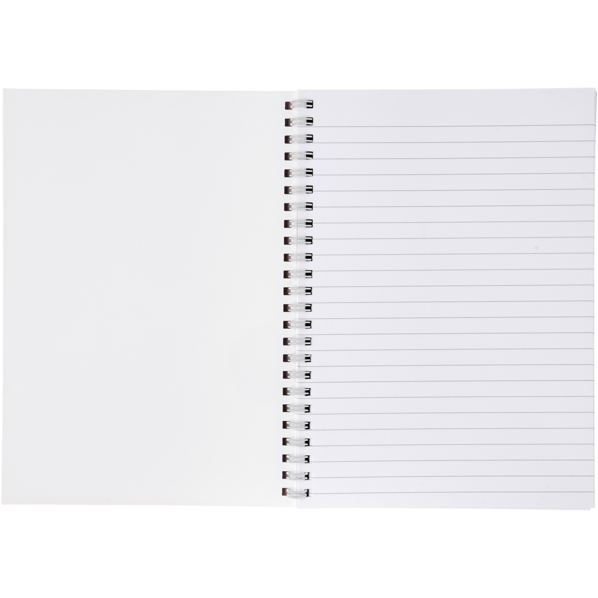 Desk Mate®-kierremuistikirja, A5. Sis. 50 (80 g/m2) tyhjää paperiarkkia ja (450 g/m2) etukannen. Kansi on repeytymisen- ja vedenkestävää. Musta tai valkoinen kierre. Voit räätälöidä muistikirjan täysin. Valitse esimerkiksi viivoitetut, ruudulliset tai blankot sivut - kaikki on mahdollista!
